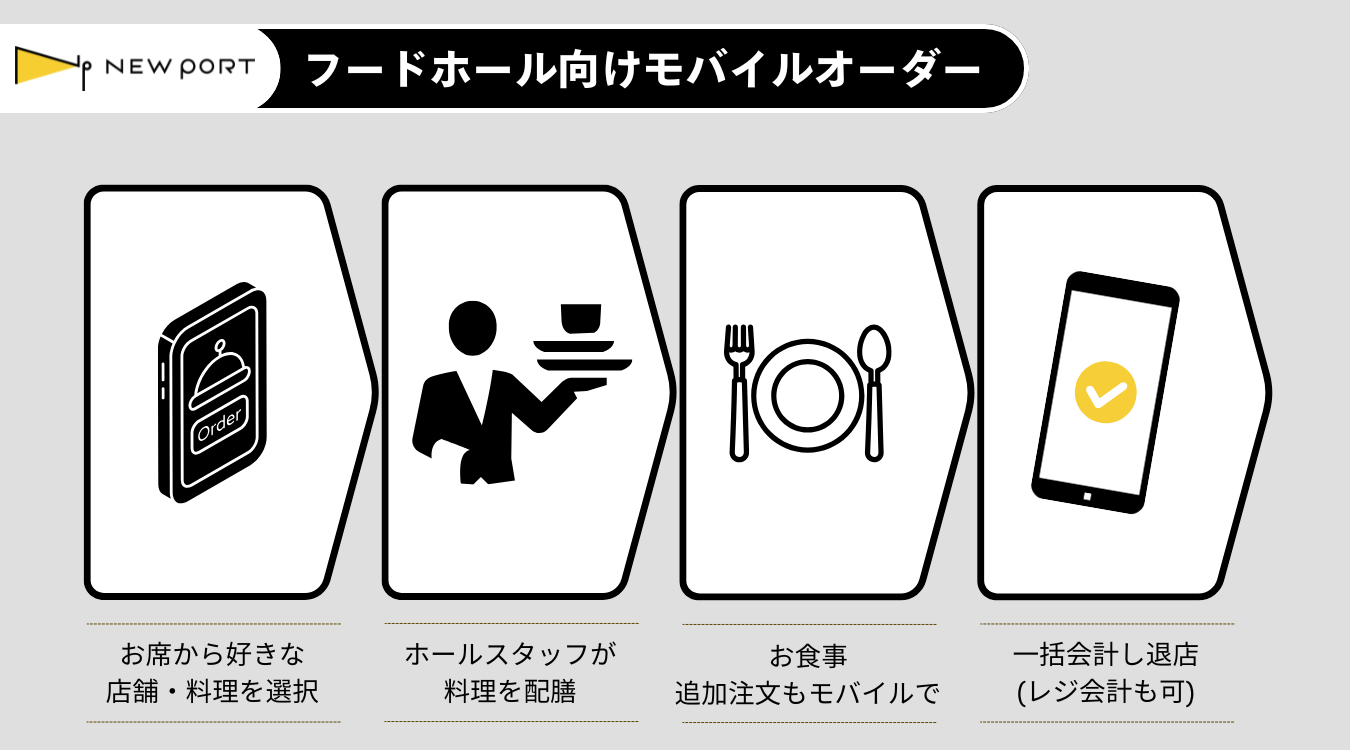フードホール内の店舗を横断して同時に注文ができる「買いまわり」機能を搭載しており、お客様は席に座ったまま好みの料理をゆっくりと注文・決済できる快適な注文体験を実現しています。さらに本フードホールは「フルサービス型モバイルオーダー」として、ホールスタッフによるお食事の配膳連携、食事後の一括会計もNEW PORTがシームレスに対応します。