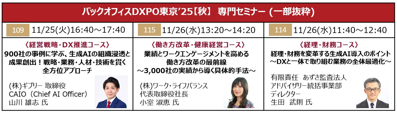 経営戦略・DX推進コースでは、(株)ギブリー 取締役 CAIO 山川雄志氏が、全社的に生成AIを導入して成果を上げるためのAIイネーブルメント戦略を紹介。また働き方改革・健康経営コースでは、3,000社以上の働き方改革を支援してきた(株)ワーク・ライフバランス 代表取締役社長 小室淑恵氏が、持続的な企業成長をもたらす働き方改革の成功のポイントを解説する。他にも人事・総務・経理のプロは勿論、業務改革・DXを推進する経営者・管理職必聴のセミナーが多数開催される。
