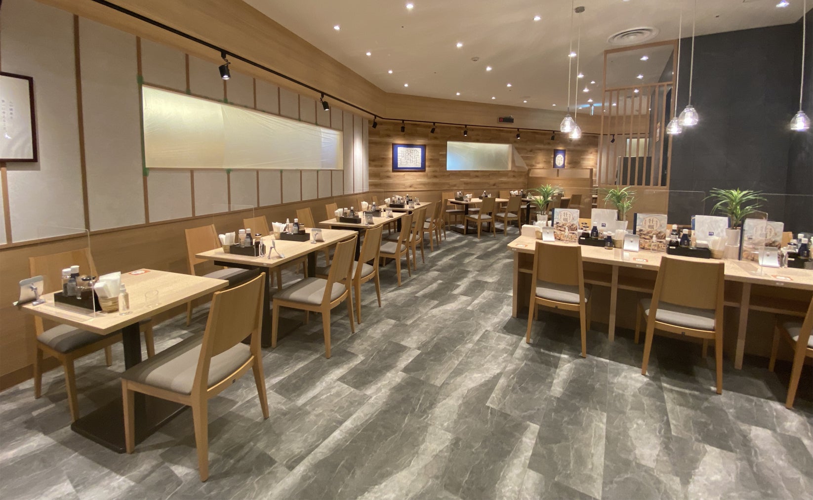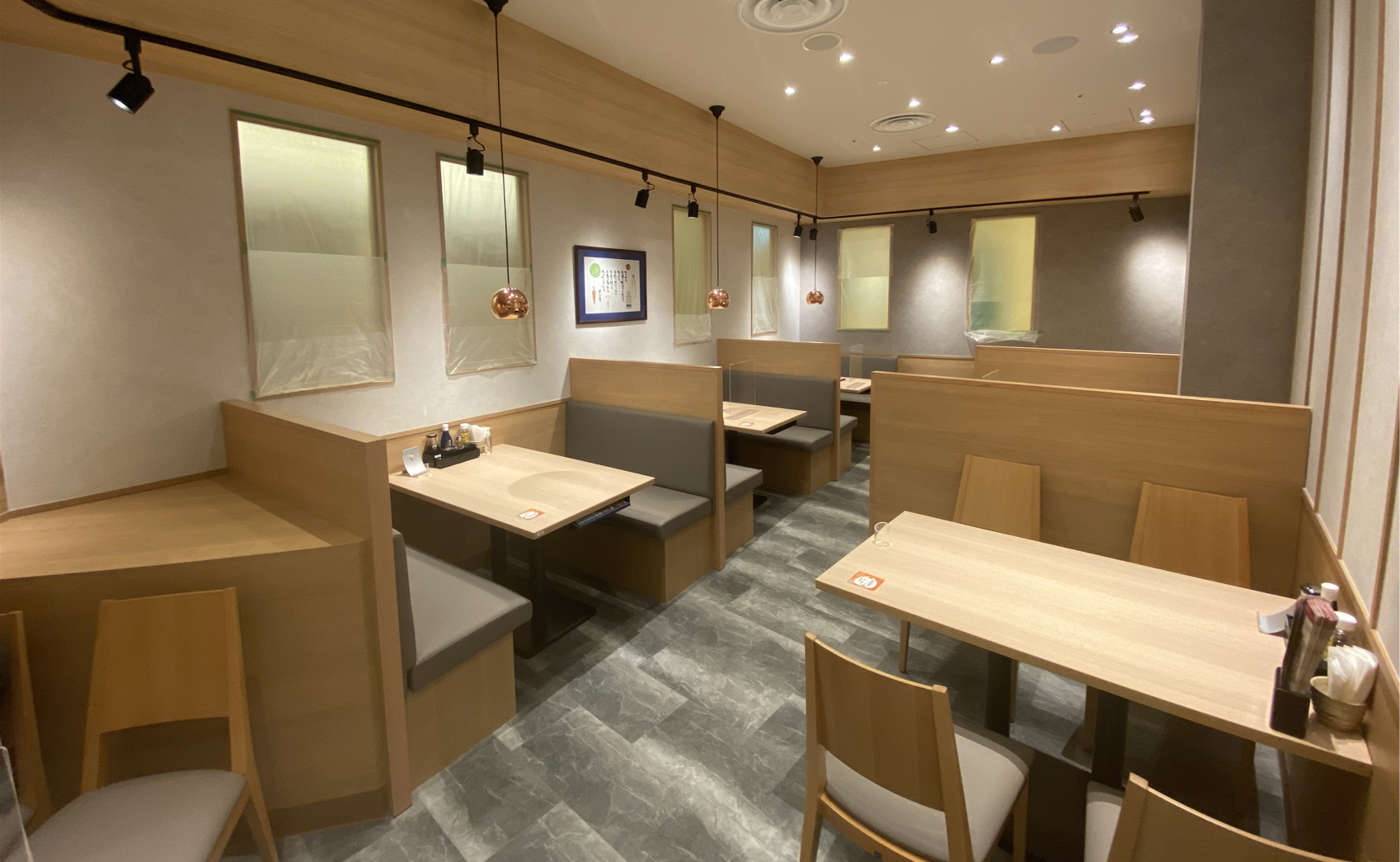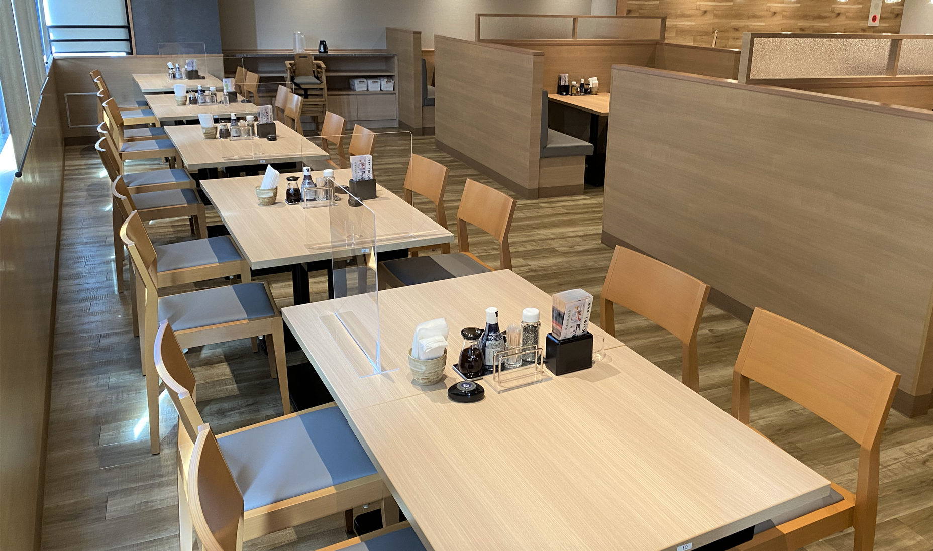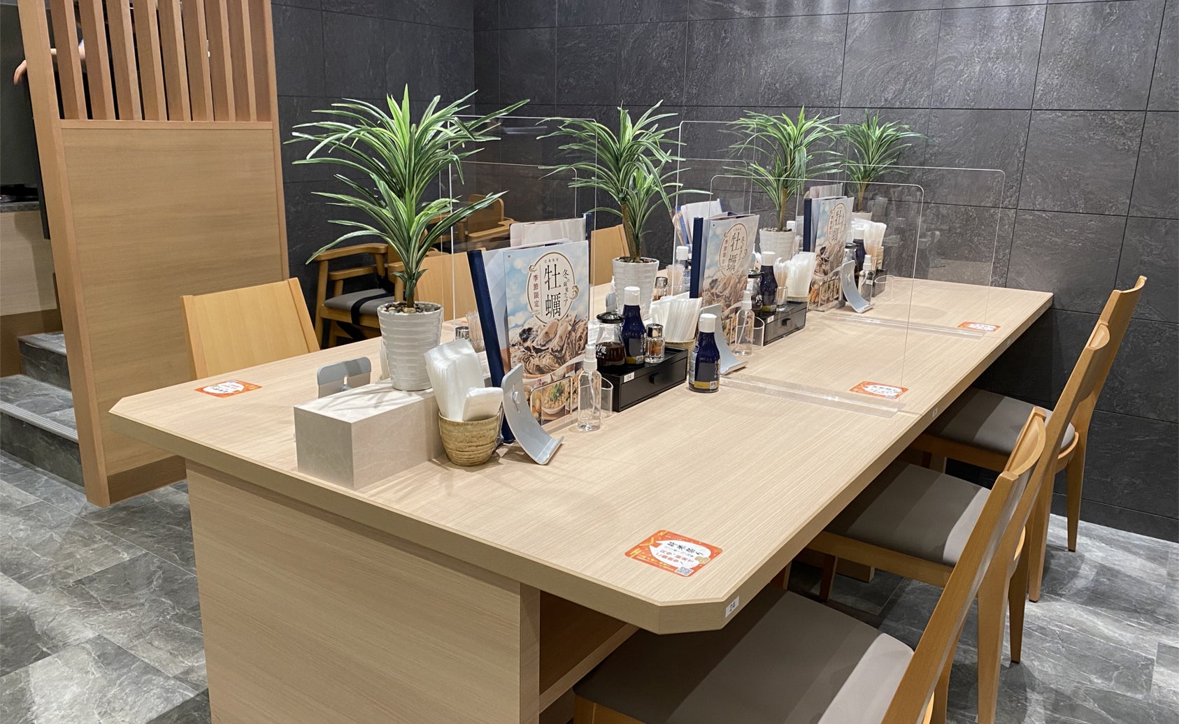和の落ち着いた雰囲気で木のぬくもりが感じられる店内は、ゆっくりとくつろぎながらお食事が楽しめます。また、全席タブレット端末によるセルフオーダーシステムを導入しておりお客様と従業員の安心・安全の為、対面サービスをできる限り少なくしております。
