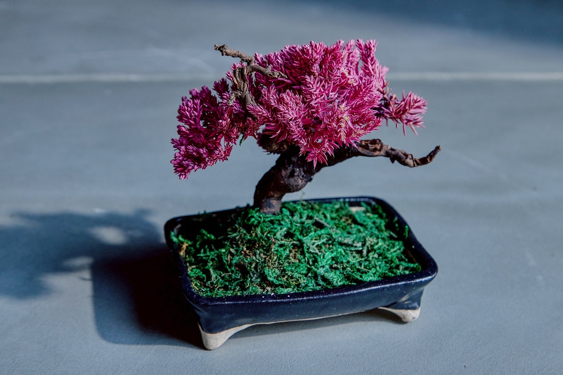 そこに独自にドライ化した別の葉やプリザーブド仕様の枝葉を付けて元の盆栽の歴史感に斬新な魅力を加えて世界で唯一のアートピースを作り上げていきます。