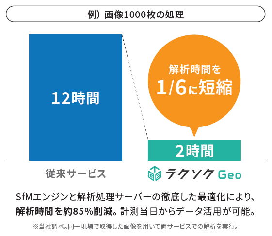 SfMエンジンと解析処理サーバーの徹底した最適化により、約85%の解析時間の削減が可能です。例えば、画像1000枚を処理する場合、従来のサービスでは約12時間かかっていたところを、ラクソクGeoは約2時間で解析が完了します。計測した当日からデータをご活用いただくことが可能になります。