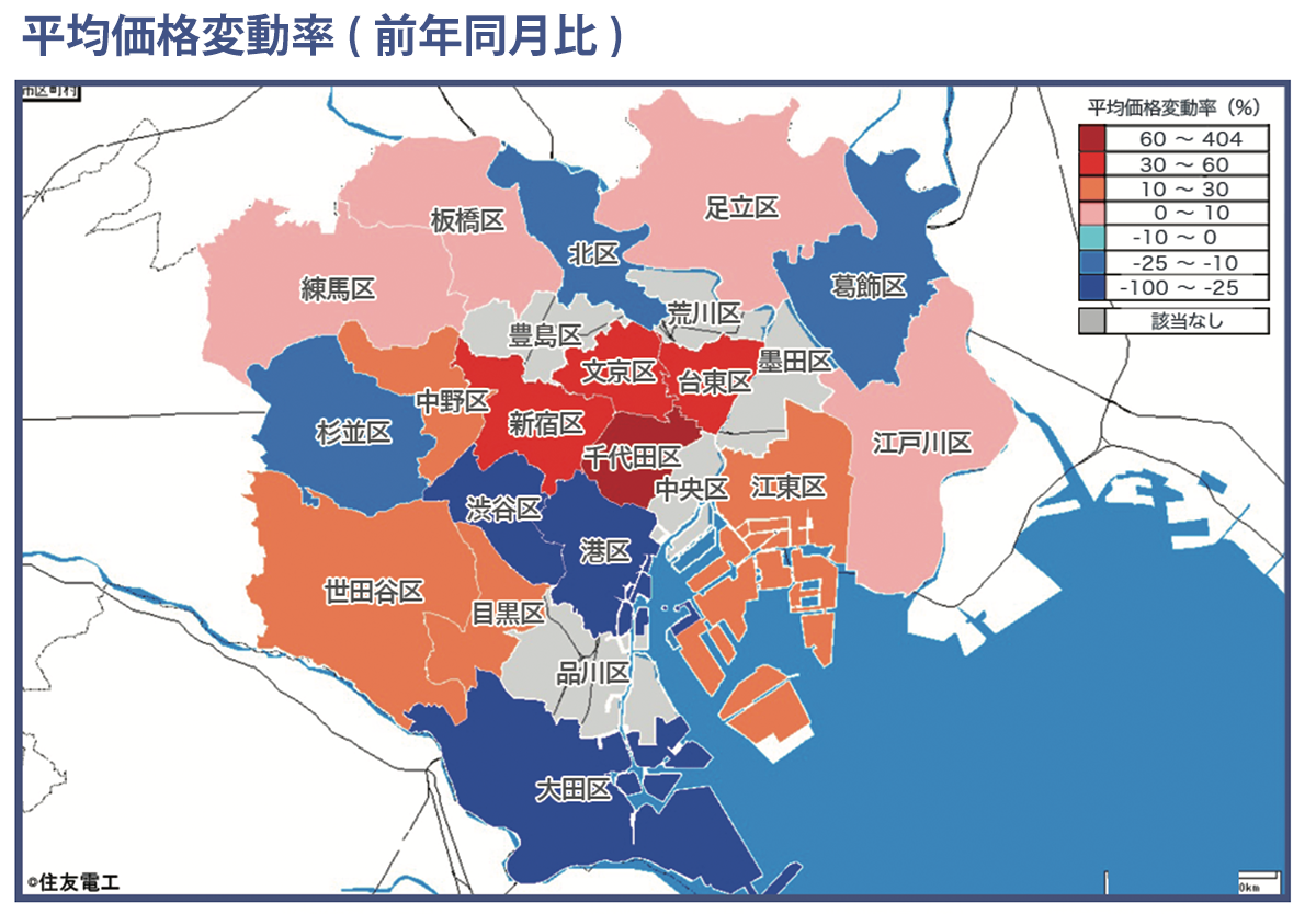 地図の各行政区ごとの色の違いは、同行政区における平均価格の前年同月比(平均価格変動率)の程度を表しています。