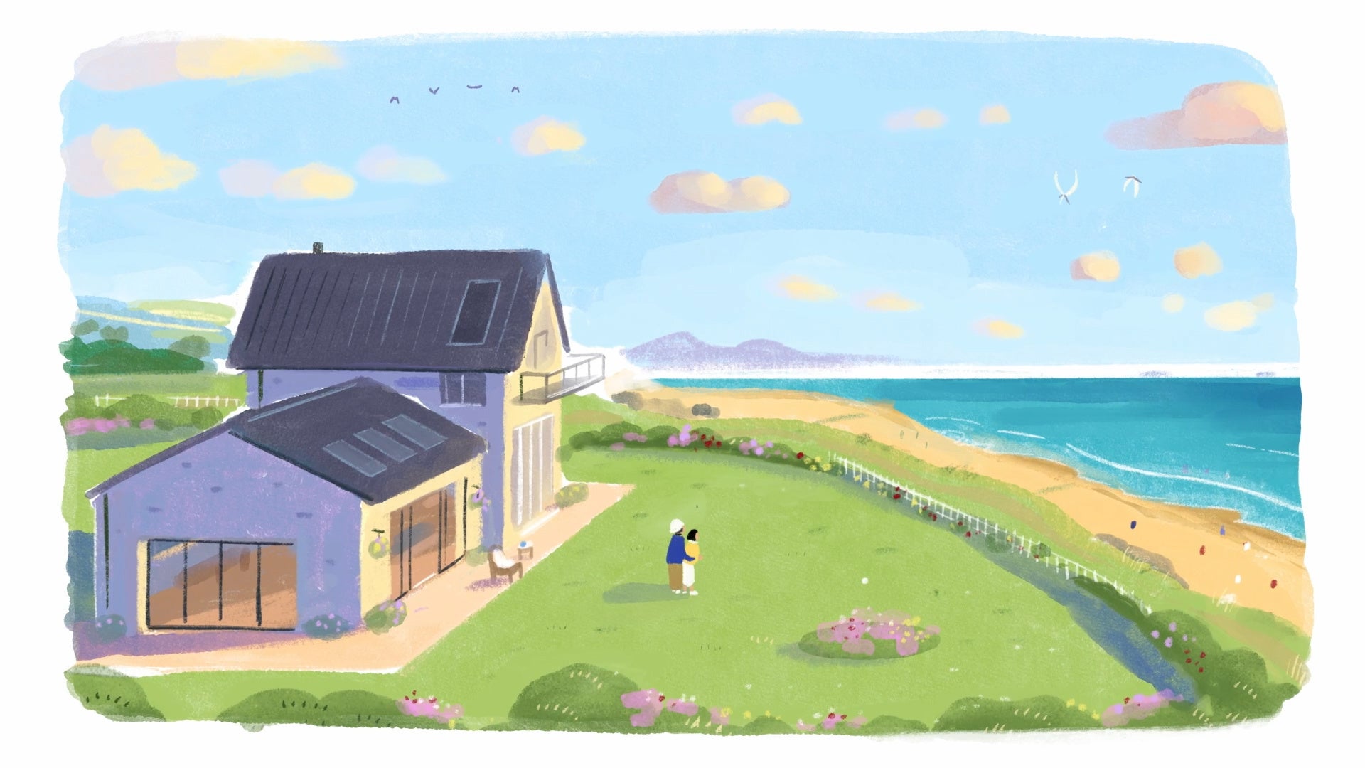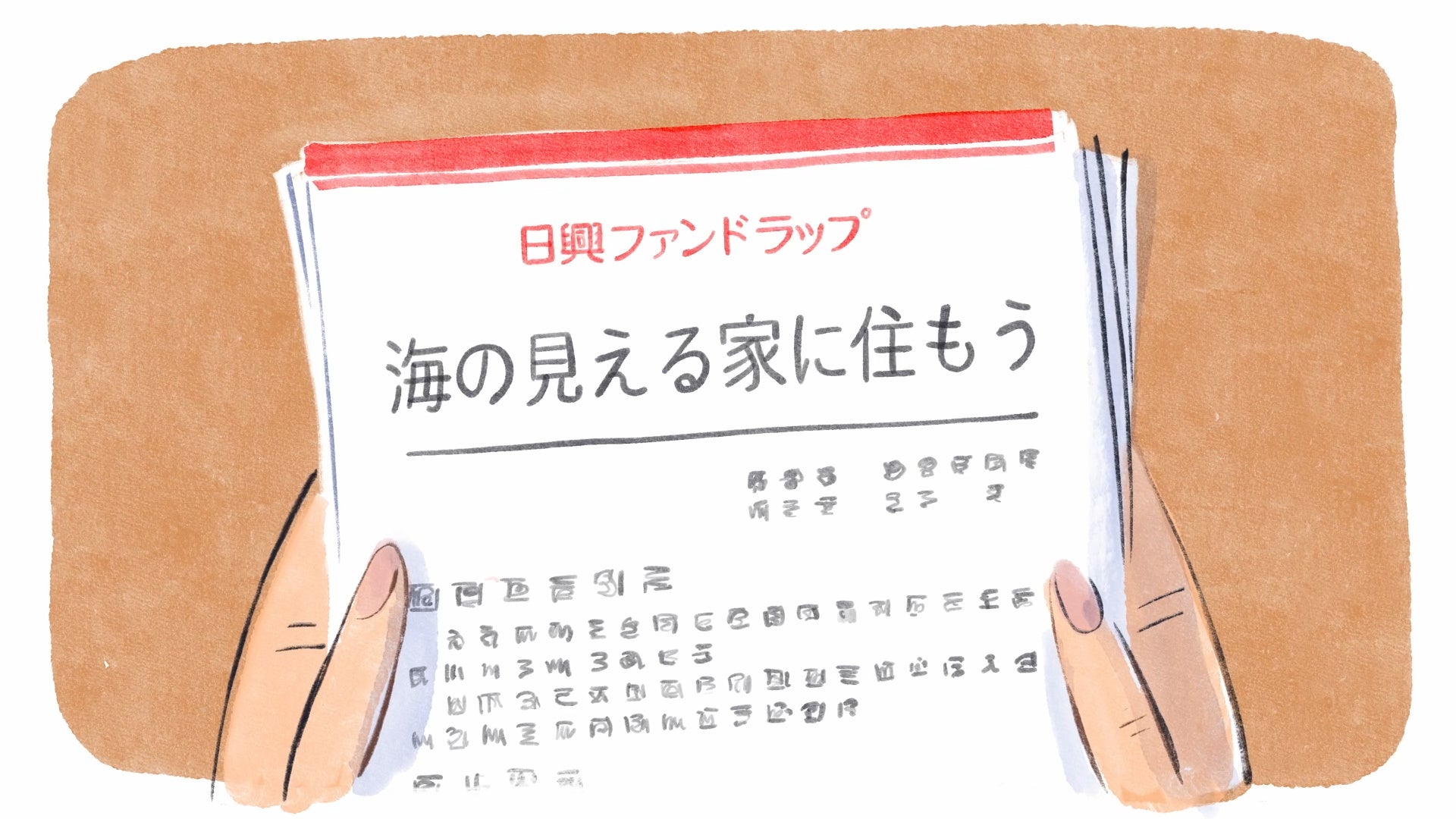4冊目の主人公は、仕事人間のD氏。仕事に没頭するあまり、妻との会話が朝の挨拶だけになってしまう日も。そんなある日、深夜に帰宅すると、寝ている妻の枕元に「海が見える家」の雑誌が。担当者へ投資の相談をしているとき、「ファンドラップに名前がつけられる」と聞き、D氏はサプライズを思いつきます。月日は流れ、退職を迎えた日、D氏は妻にある封筒を手渡しました。それは、ファンドラップの運用報告書。タイトルは「海が見える家に住もう」というメッセージになっていたのです。海が見える場所に家を建てた夫婦。D氏は妻に、ふたりで過ごす時間をプレゼントしたのでした。