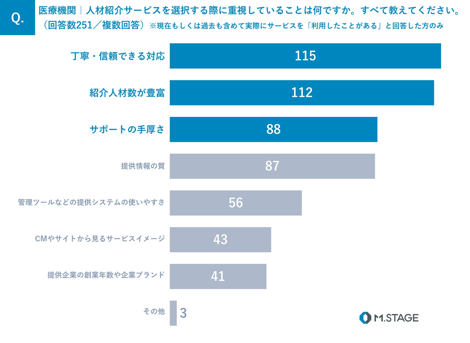 医師の人材紹介サービスを利用したことがある担当者において、紹介サービスの選択時に重視していることは「丁寧・信頼できる対応」(115)が最も多く、次いで「紹介人材数が豊富」(112)、「サポートの手厚さ」(88)が続く結果となりました。