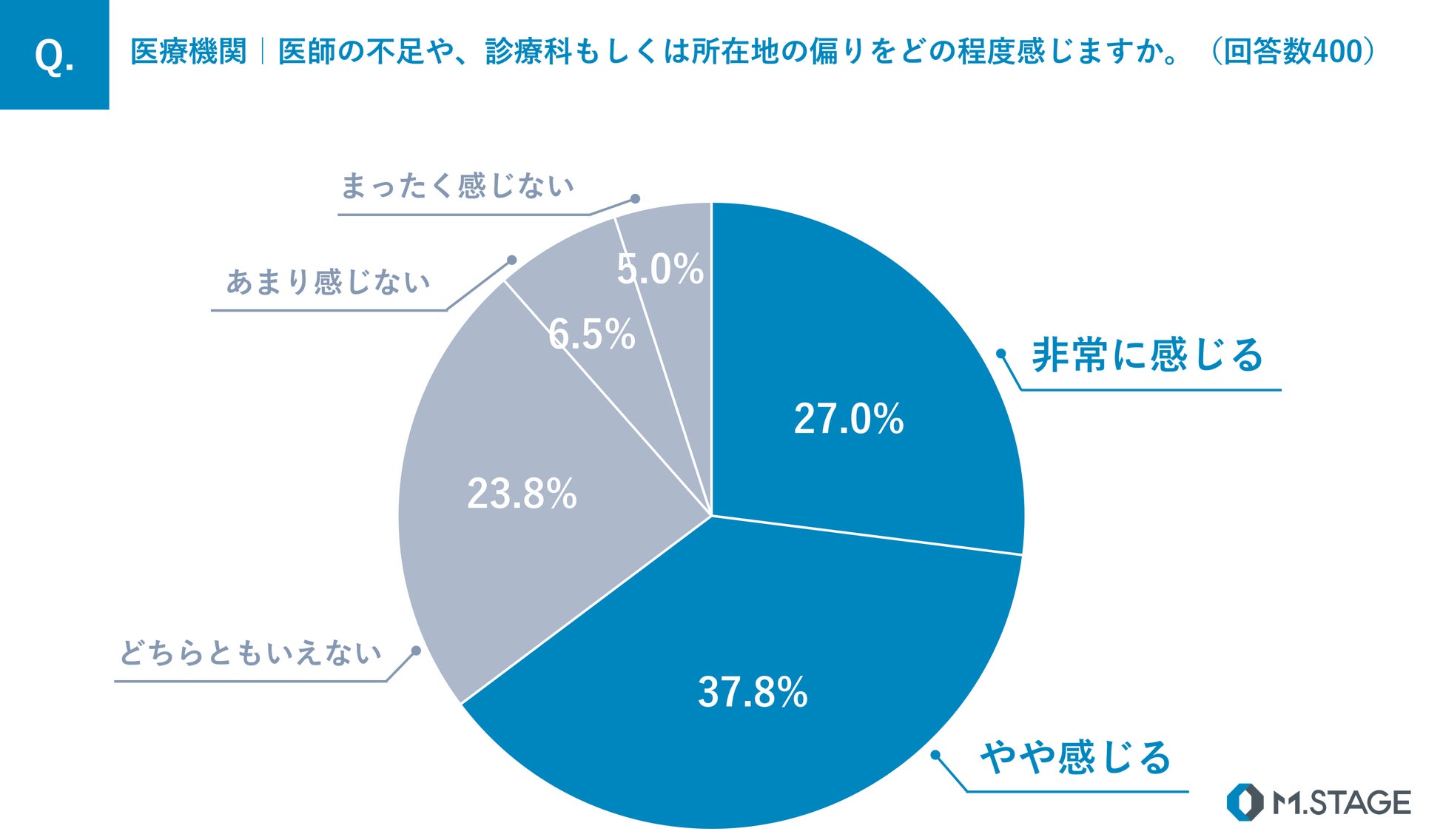 医師の不足や、診療科もしくは所在地の偏りを「非常に感じる」と回答した医療機関の採用担当者は27.0%、「やや感じる」と回答した担当者は37.8%となり、6割以上の担当者は医師の不足や偏在を感じている結果となりました。