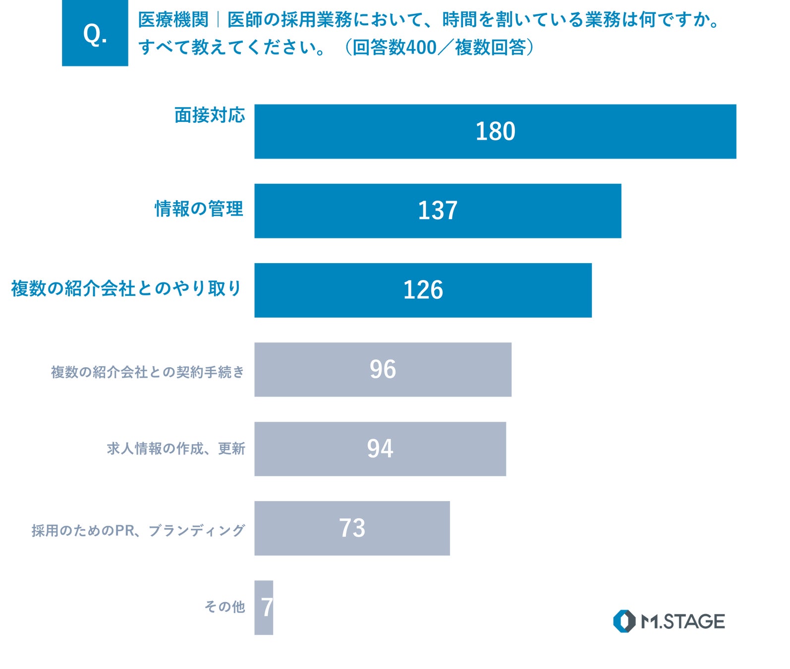 医師の採用業務において、最も時間を割いている業務は「面接対応」(180)となり、次いで「情報の管理」(137)、「複数の紹介会社とのやり取り」(126)が続く結果となりました。