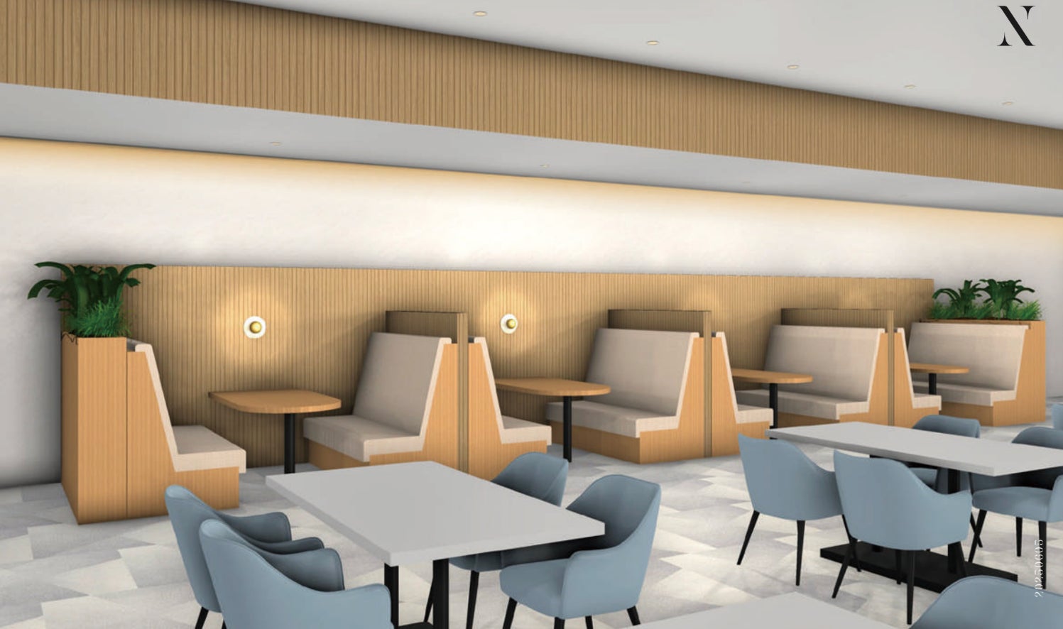 お客様にゆったりとお過ごしいただけるよう、空港のラウンジのような落ち着いた雰囲気を持たせ、高級感のあるデザインに仕上げています。カフェは様々な種類のお飲み物をご用意しており、商談スペースやラウンジスペースへ自由にお持ち込みいただけます。
