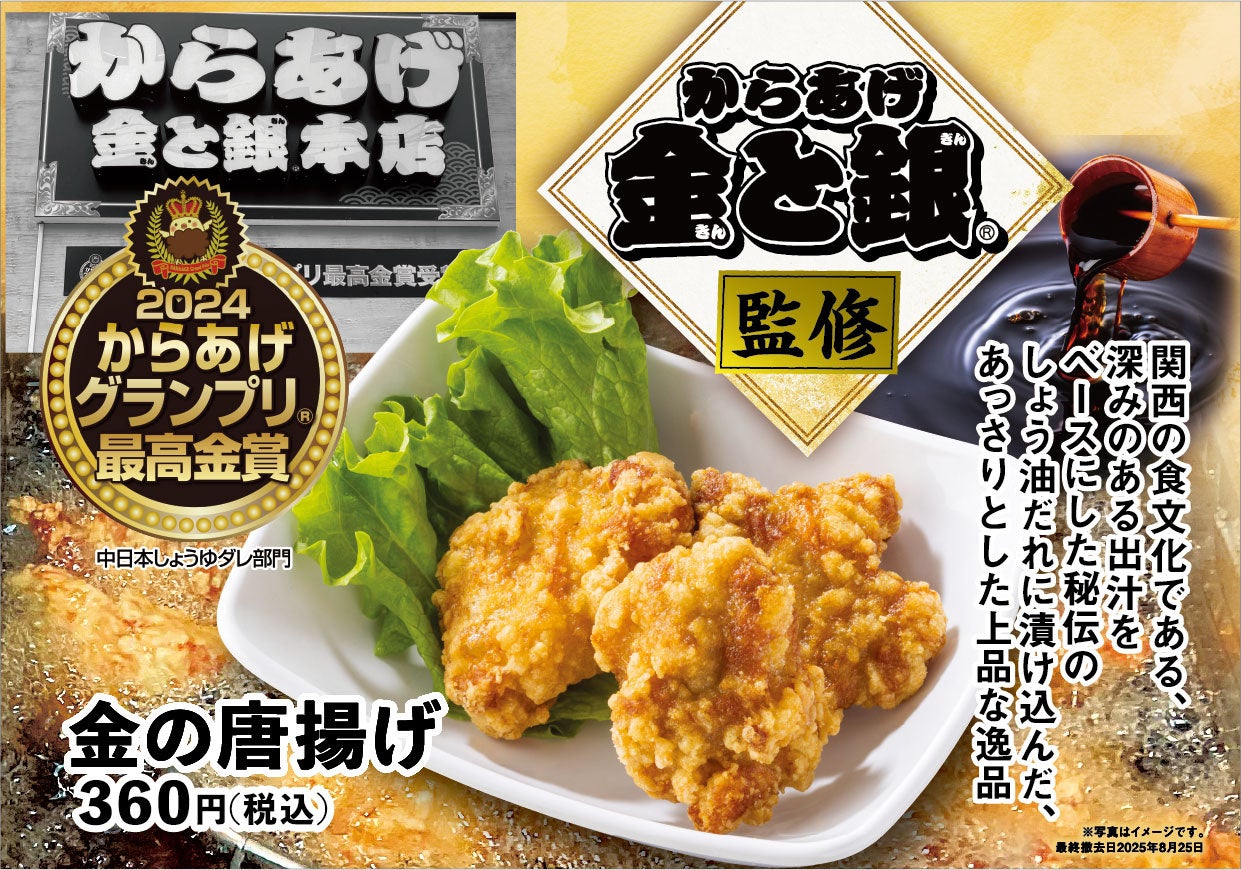 さらにサイドメニューとして、関西発の人気唐揚げ専門店「からあげ金と銀」監修の「金の唐揚げ」も期間限定でご提供いたします。「からあげグランプリ® 」最高金賞・連続金賞、「とりからグランプリ」優勝と、数々の栄誉に輝いた本格派の味わいも、この機会にぜひお楽しみください。