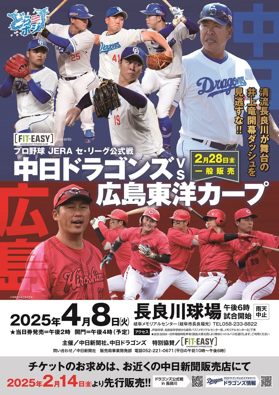 「中日新聞社」はドラゴンズ公式戦in長良川 FIT-EASY presents プロ野球JERAセ・リーグ公式戦『中日ドラゴンズVS広島東洋カープ』を4月8日火曜日午後6時からぎふ長良川球場で開催します。
