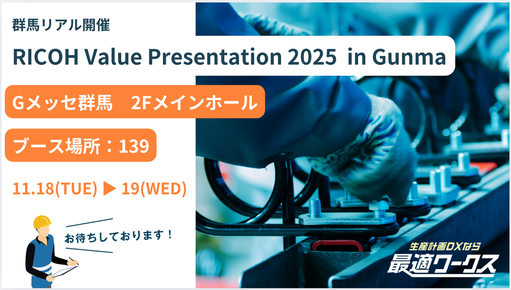 本展示会は、「DX・AI・GXで拓く未来の価値創造 ~リコージャパンから始まる変革のストーリー~」をテーマに、生成AIやサステナブル経営をはじめとする最新のDX・GXソリューションが集結するイベントです。スカイディスクは、生産計画最適化ソリューション「最適ワークス」を中心に、AIを活用した製造現場の課題解決の具体的なアプローチをご紹介します。