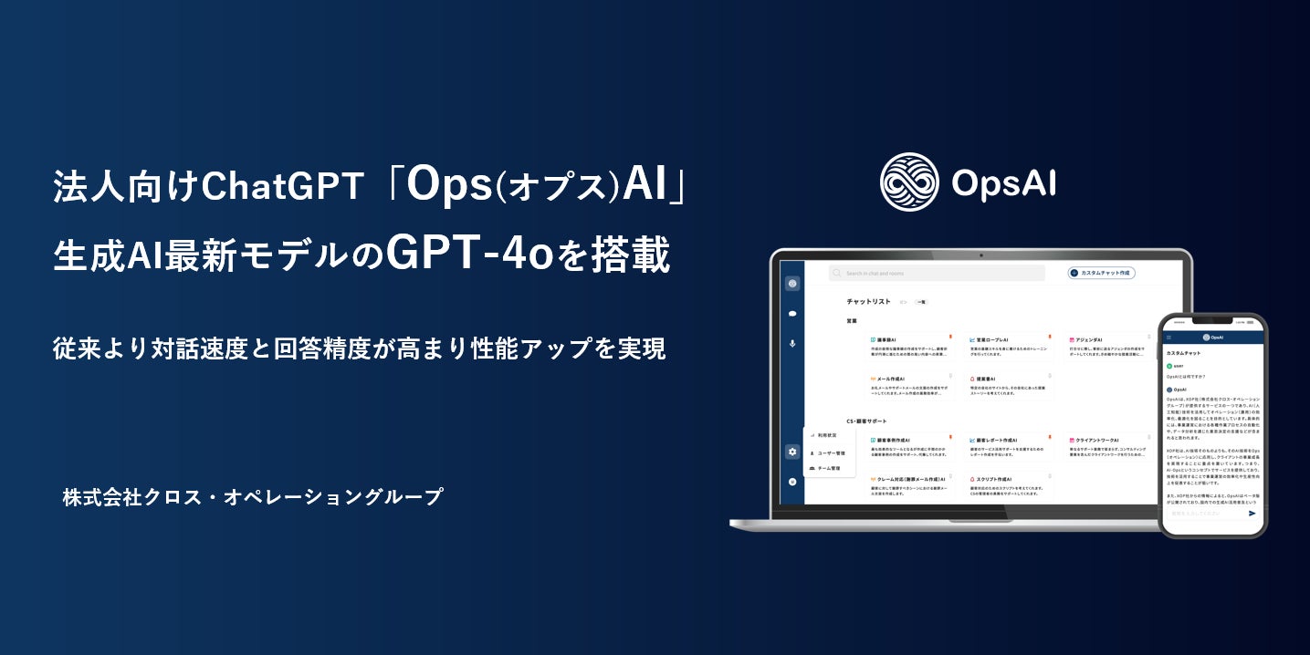 BizOps専門カンパニーとして、先端技術の業務(Ops)融合を得意とし、生成AIを活用した業務改善支援を行う株式会社クロス・オペレーショングループ(東京都千代田区、代表取締役:田中 亮大、以下XOP)は、自社で開発する法人向けChatGPT「Ops(オプス)AI」の基盤を最新の生成AIモデルであるGPT-4oに切り替えバージョンアップさせたことをお知らせします。「Ops(オプス)AI」ビジネスでの業務活用に特化したモデルです。標準ChatGPTに搭載されていない機能も多数あり、複数名で利用する場合にはOpsAIの方が価格優位性もあるサービス設計になっています。OpsAIは導入企業のDX推進、オペレーション改善を促進します。※Ops=Operations / オペレーションの略称