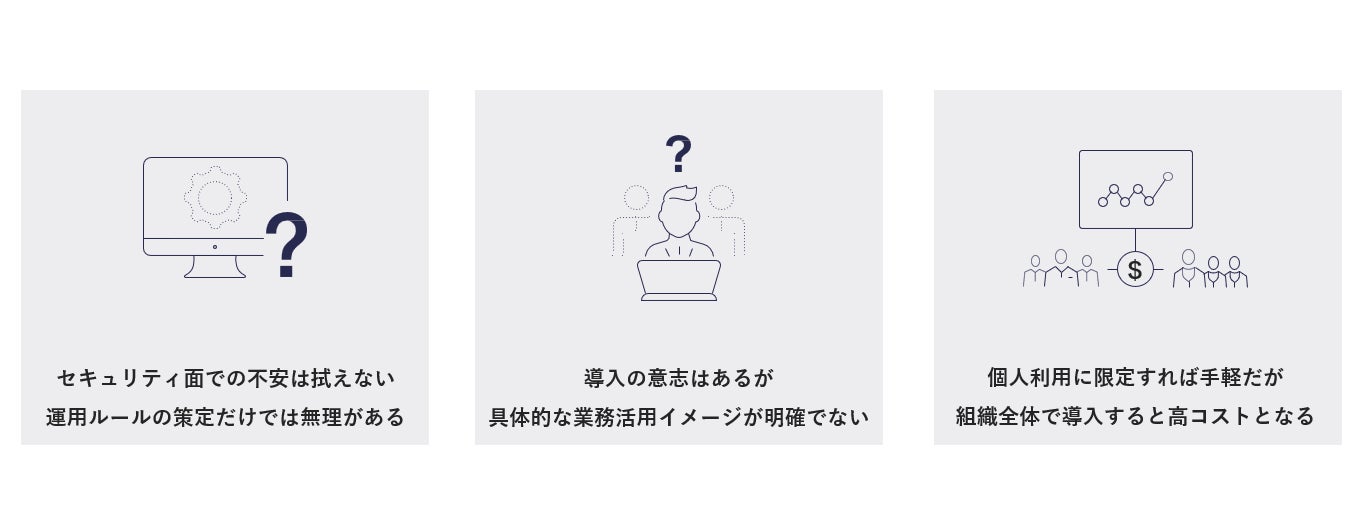 OpsAIは、ChatGPTの法人利用・業務改善を目的として開発されました。ChatGTPの法人利用における下記3点の課題を全てクリアにしています。