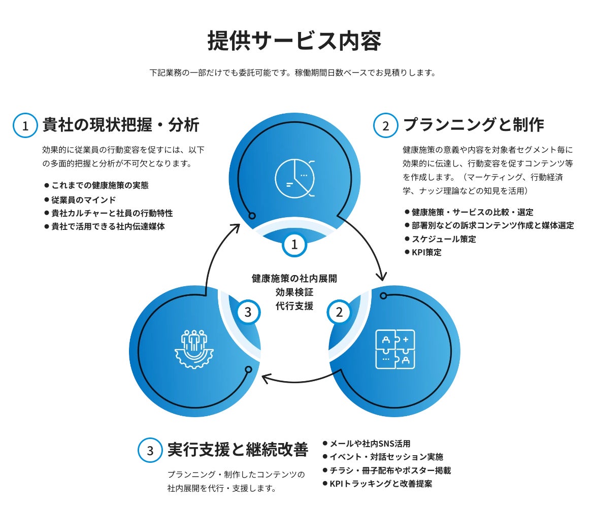 健康施策・外部健康サービスの比較・選定、拠点・階層・従業員の健康リテラシー等に応じたセグメンテーション、健康施策の意義や内容を対象者セグメントごとに効果的に伝達し、行動変容を促すコンテンツ等作成と適切な情報伝達媒体の選定の他、スケジュール策定、KPI設定など