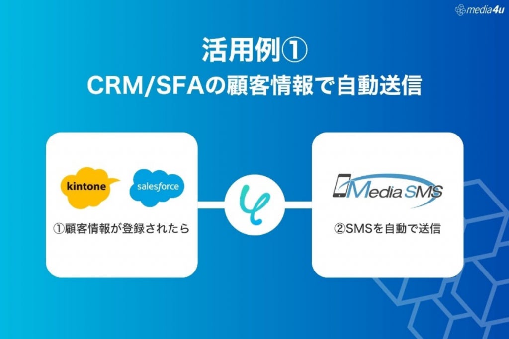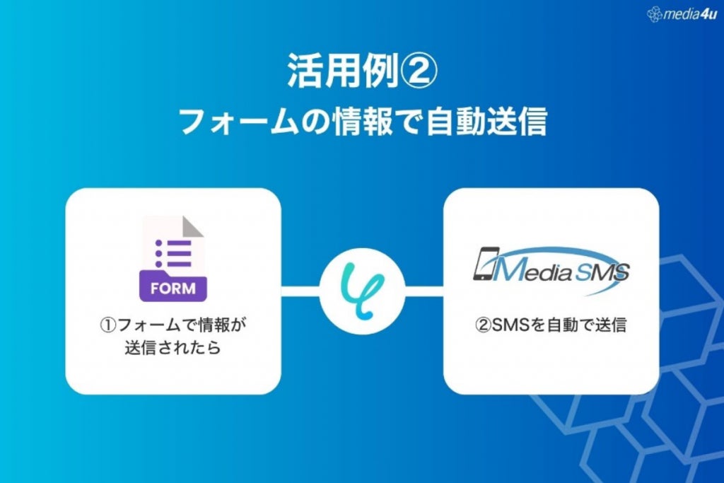 株式会社ファブリカホールディングス(本社:東京都港区、代表取締役社長CEO:谷口 政人)の完全子会社で、国内法人向けSMS配信数シェアNo.1(※)を誇る「メディアSMS(https://media-sms.net/)」を提供する株式会社メディア4u(本社:東京都港区、代表取締役社長:岩館 徹)は、あらゆるデスクワークを自動化するハイパーオートメーションツール「Yoom(ユーム)(https://lp.yoom.fun/)」を開発・運営するYoom株式会社(本社:東京都千代田区、代表取締役:波戸﨑 駿)とAPI連携を開始しました。