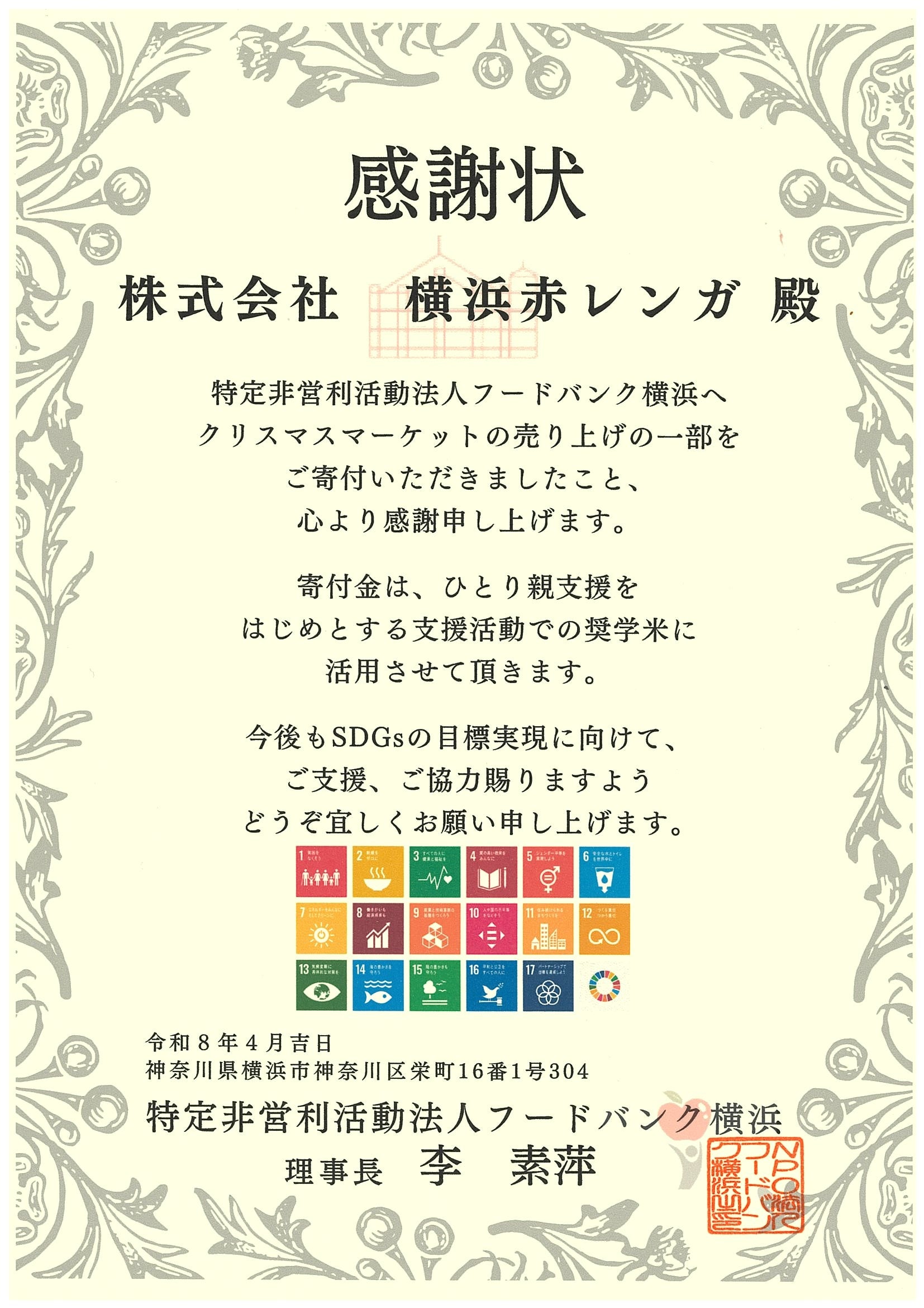株式会社横浜赤レンガ(本社:横浜市、代表取締役 岩﨑求起(以下、当社))は、SDGsの取組「笑う、サステナブル」活動の一環として、「Christmas Market in 横浜赤レンガ倉庫」にて限定販売したオリジナルマグカップの売り上げの一部を、特定非営利活動法人フードバンク横浜(以下、フードバンク横浜)へ寄付しました。