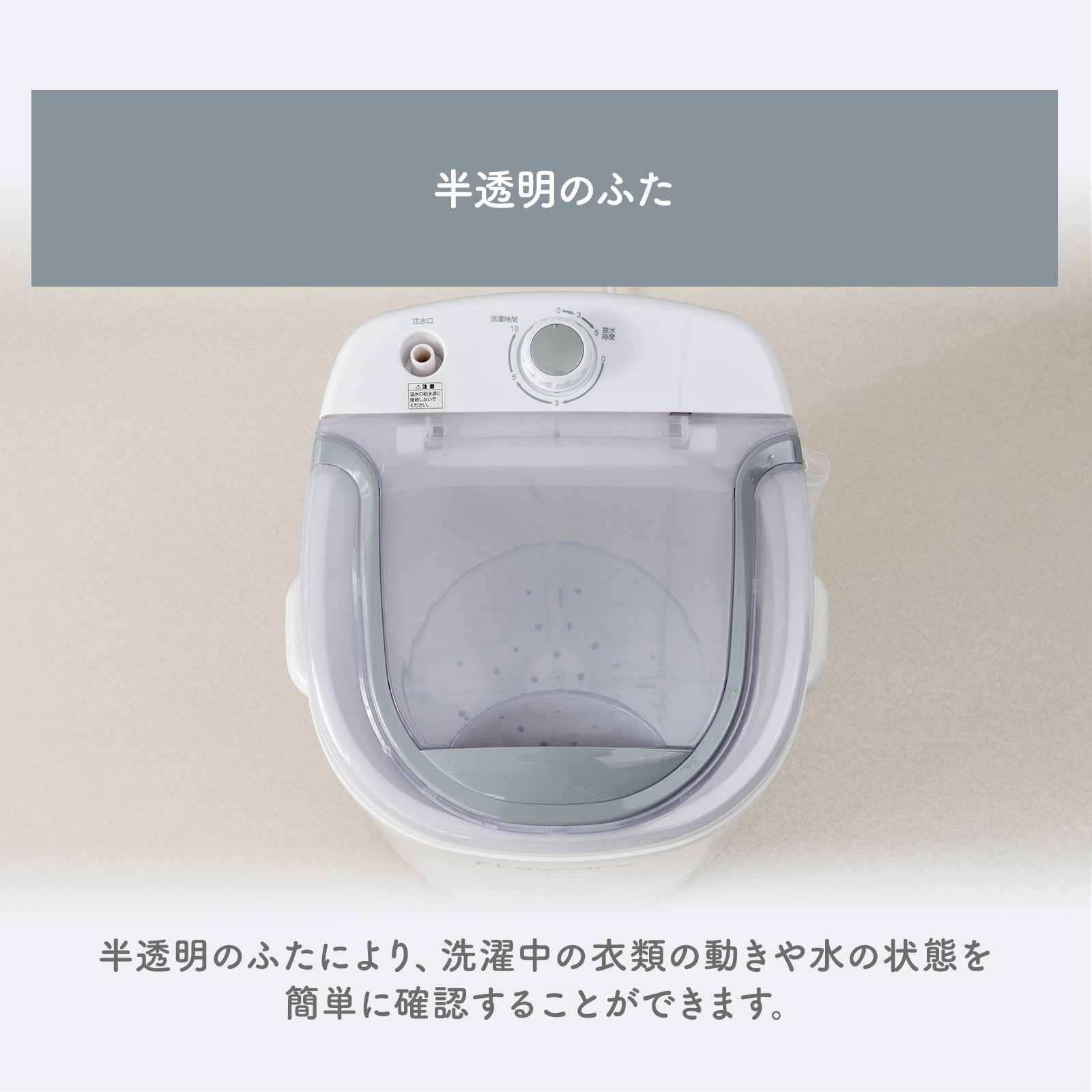 洗濯・すすぎ・排水の機能を備えた予洗いや仕分け洗いに便利な小型洗濯機です。グレーのクリアトップパネルを採用、洗濯中の様子を外から目視で確認できます。