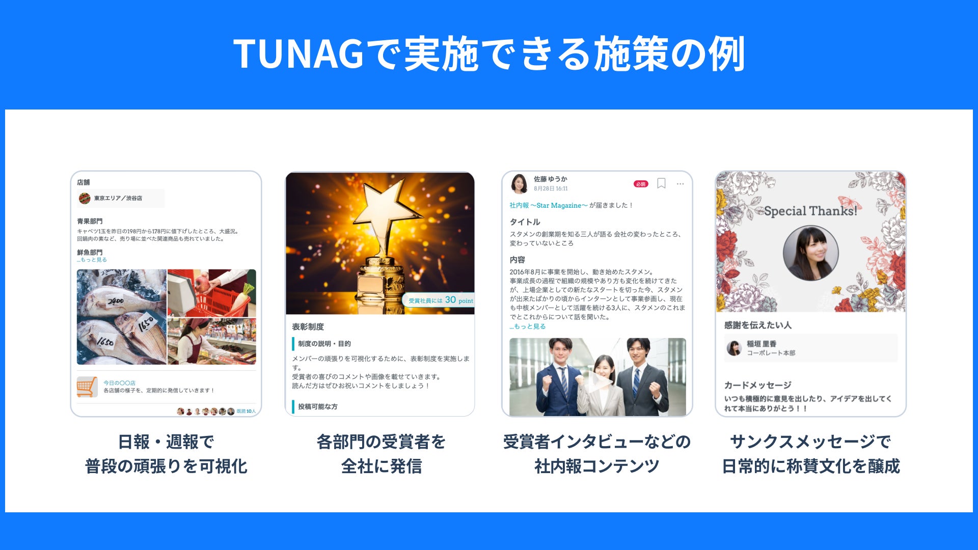 TUNAGでは、そうした一連の取り組みをまとめて運用可能です。具体的には、日報・週報、表彰者の発表、社内報コンテンツ、サンクスメッセージなどの機能を豊富に持ち合わせています。スマホアプリで使いやすいUIにこだわっており、飲食業界や小売業界の現場社員やアルバイト、物流業界のドライバーの方も手軽にご利用いただけます。