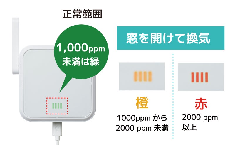 - 本体LEDでCO2濃度レベルを表示、その場で確認