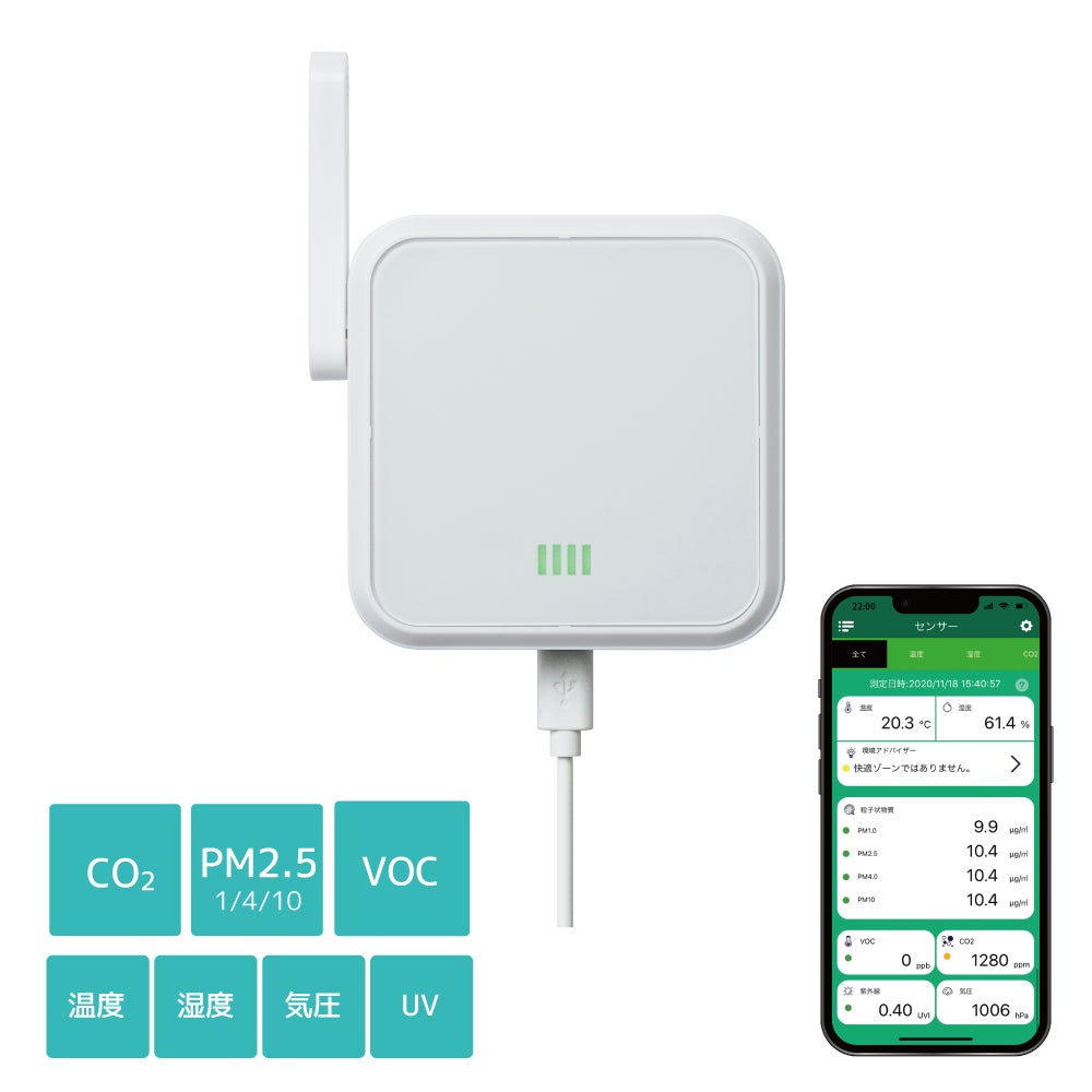 CO2、PM1/2.5/4/10、VOC、温度、湿度、気圧、UV