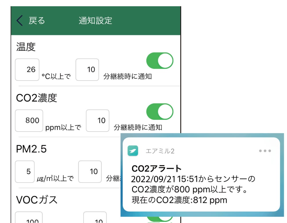 スマホで値やグラフを確認、本体LEDでCO2濃度をレベル表示