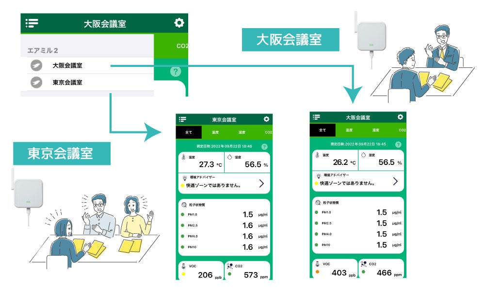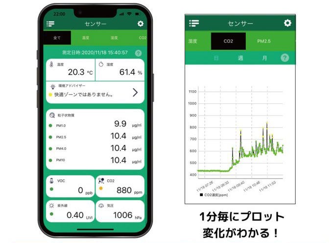 計測結果はスマホやタブレットに表示、設置場所から離れた場所でも、手元の画面で確認できます。