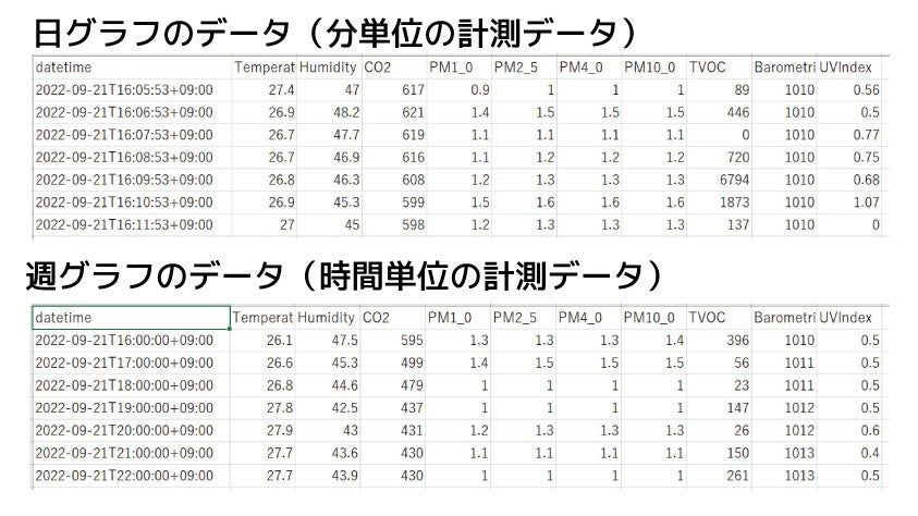 専用アプリ「エアミル2」で、メイン画面に計測値を一覧表示。グラフは日、週、月ごとの表示に対応し、日グラフでは1分ごと、月グラフでは1時間ごとにプロットします。