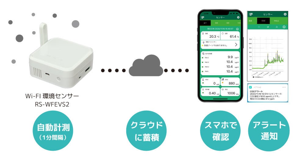 RS-WFEVS2は、換気の目安になるCO2濃度や健康に影響のある粒子状物質PM、温湿度などを計測し、スマホで確認・取得する製品です。前身となるRS-WFEVS1の豊富な計測項目や利便性はそのまま、Bluetoothを使ったセットアップでよりスムーズな導入がおこなえるようになりました。