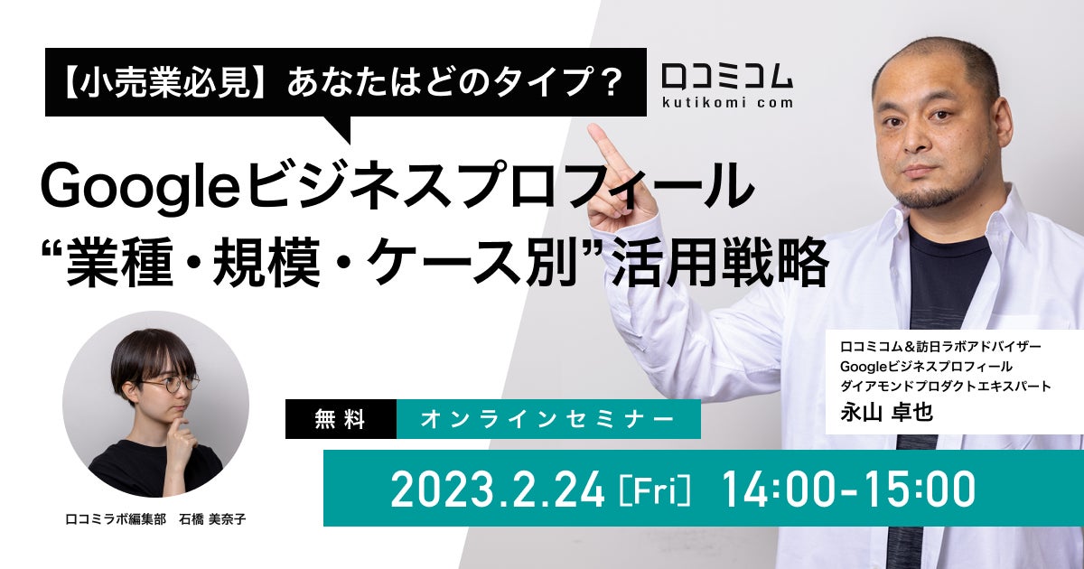 口コミサイトを”もっと”売上に変える、AI店舗支援SaaS「口コミコム」を運営する株式会社mov(代表取締役:渡邊 誠、本社:東京都渋谷区、以下mov)は、主に小売業の方向けのセミナー「あなたはどのタイプ?Googleビジネスプロフィール『業種・規模・ケース別』活用戦略」を開催します。日程は2月24日(金)14:00〜15:00、参加費は無料です。