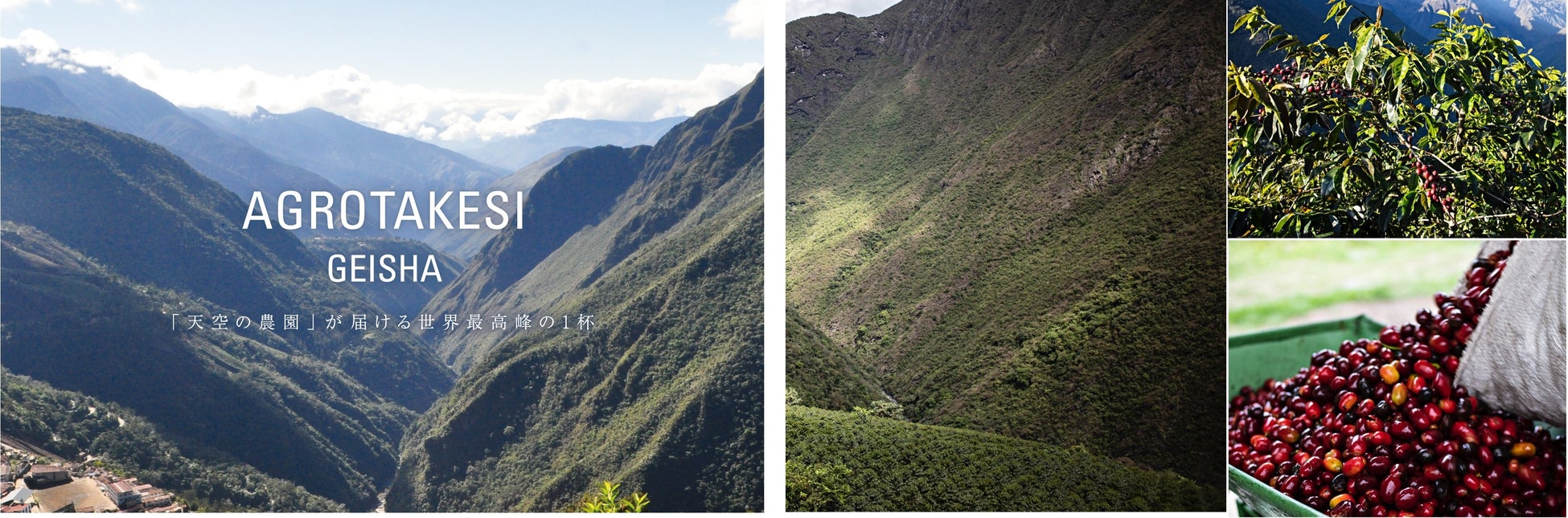 ユンガス地方は亜熱帯気候でアマゾンの入口とも呼ばれています。45~60度の傾斜の谷間にあるアグロタケシ農園は、ムルラタ山から下りてくる冷たい空気とアマゾンに続く谷から上がってくる暖かい空気が交わる特殊な気候です。また、火山性鉱山のミネラルを多く含む肥沃な土壌で、標高が高く寒暖差が大きいため、コーヒーチェリーが通常よりも長い時間をかけて熟し、特別な甘みと風味を引き出します。