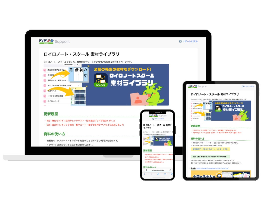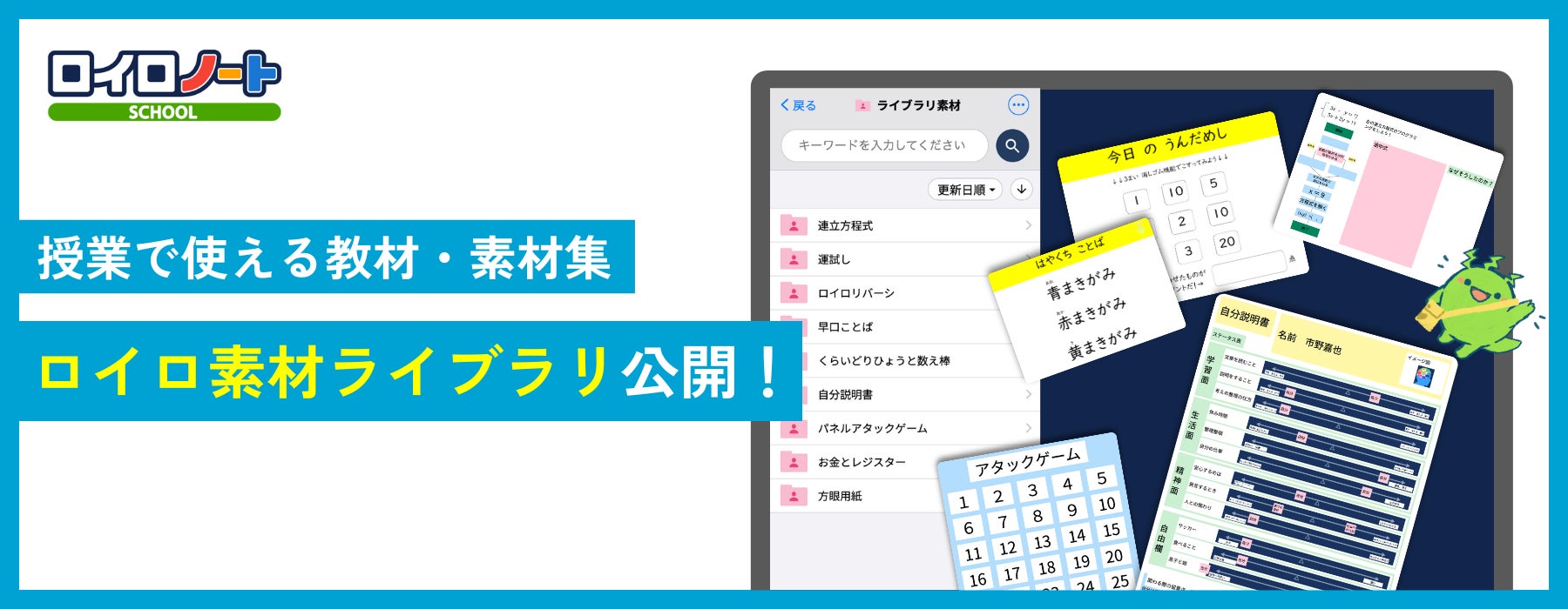 株式会社LoiLoは、授業で役立つ教材・素材を集めたサイト「ロイロ素材ライブラリ」を公開しました。アルファベットカードや書写パズル、心情メーター、AR教材など、便利な素材を多数掲載しています。すべて無料で、ロイロノート・スクールに取り込んですぐにお使いいただけます。