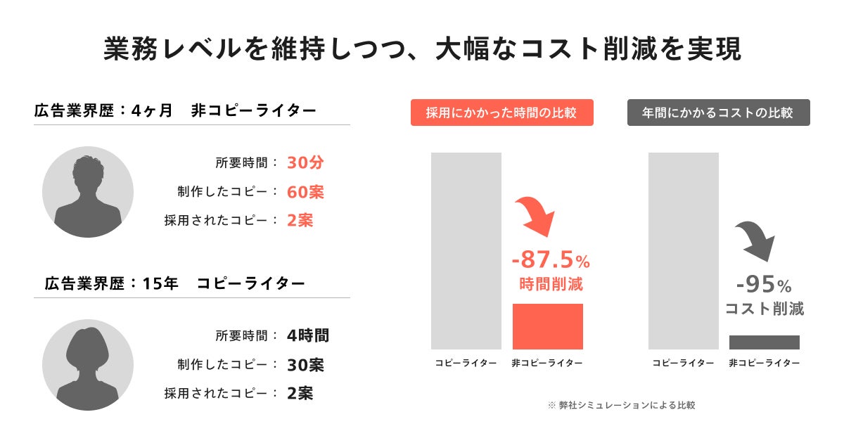 非コピーライターがプロダクトを活用し、スピーディーにプロレベルのキャッチコピーを制作することができます。我々が行ったPoCでは、初心者でも30分程度で、60案を制作することができ、業務工数に換算すると87.5%削減、費用を95%削減することができました。