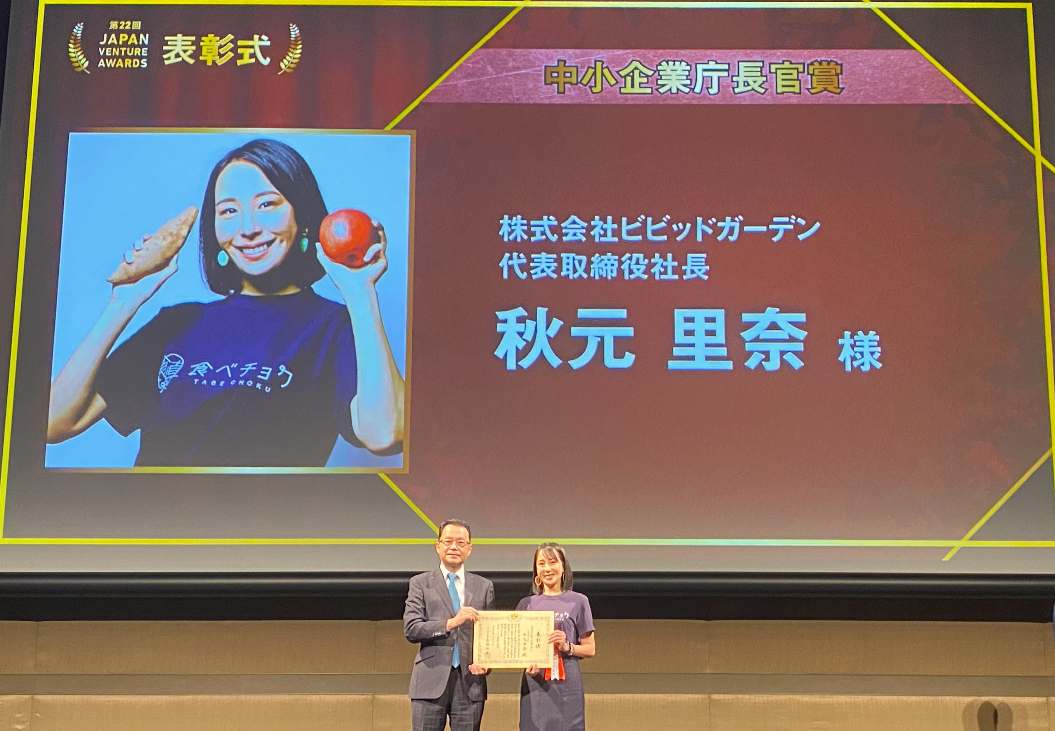 認知度・利用率など9つのNo.1(※1)を持つ日本最大の産直通販サイト「食べチョク」を運営する株式会社ビビッドガーデン(本社:東京都港区)の代表 秋元里奈は、独立行政法人中小企業基盤整備機構が主催する「第22回 Japan Venture Awards」の中小企業庁長官賞を受賞しました。