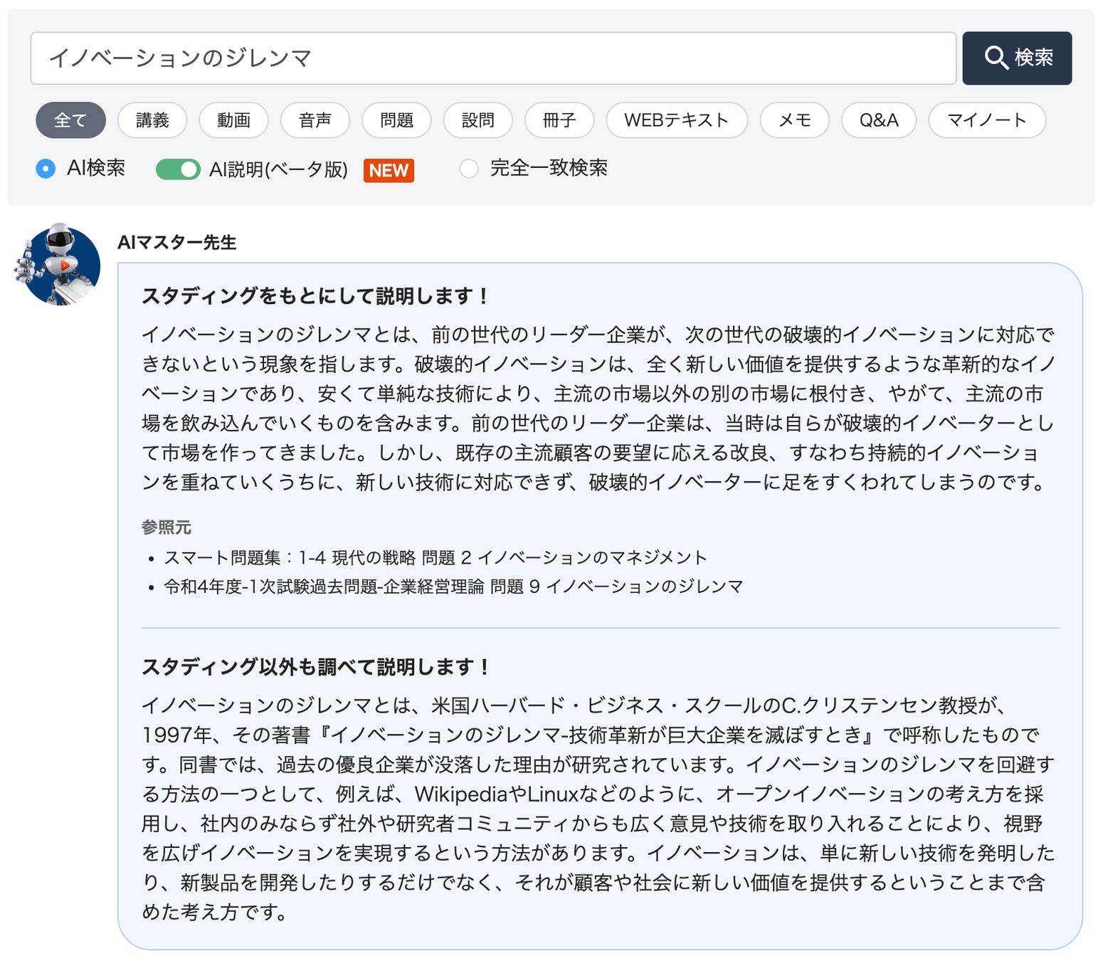 今回はその第一弾として、受講生がわからない用語を質問すると「AIマスター先生」がその場で回答してくれる「AI説明機能」(ベータ版)をリリースいたしました。スタディングの学習コンテンツをもとにした信頼性の高い回答および、生成AI(GPTモデル)の知識を加えた詳しい回答を提供することで、受講者がよりスムーズに学習を進められるようにしています。