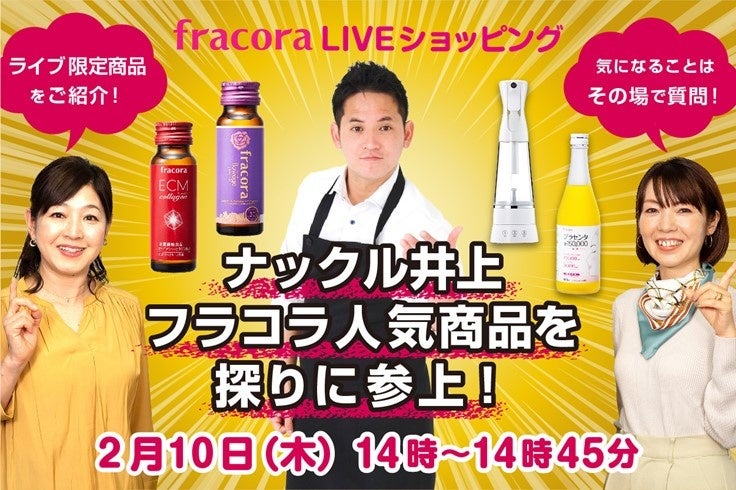 2月10日に開催する「fracora LIVEショッピング」には、人気の実演販売士ナックル井上さんが登場!フラコラの人気商品を深堀しながらお客様の知りたい情報を楽しくお伝えしていきます。是非ご覧ください。