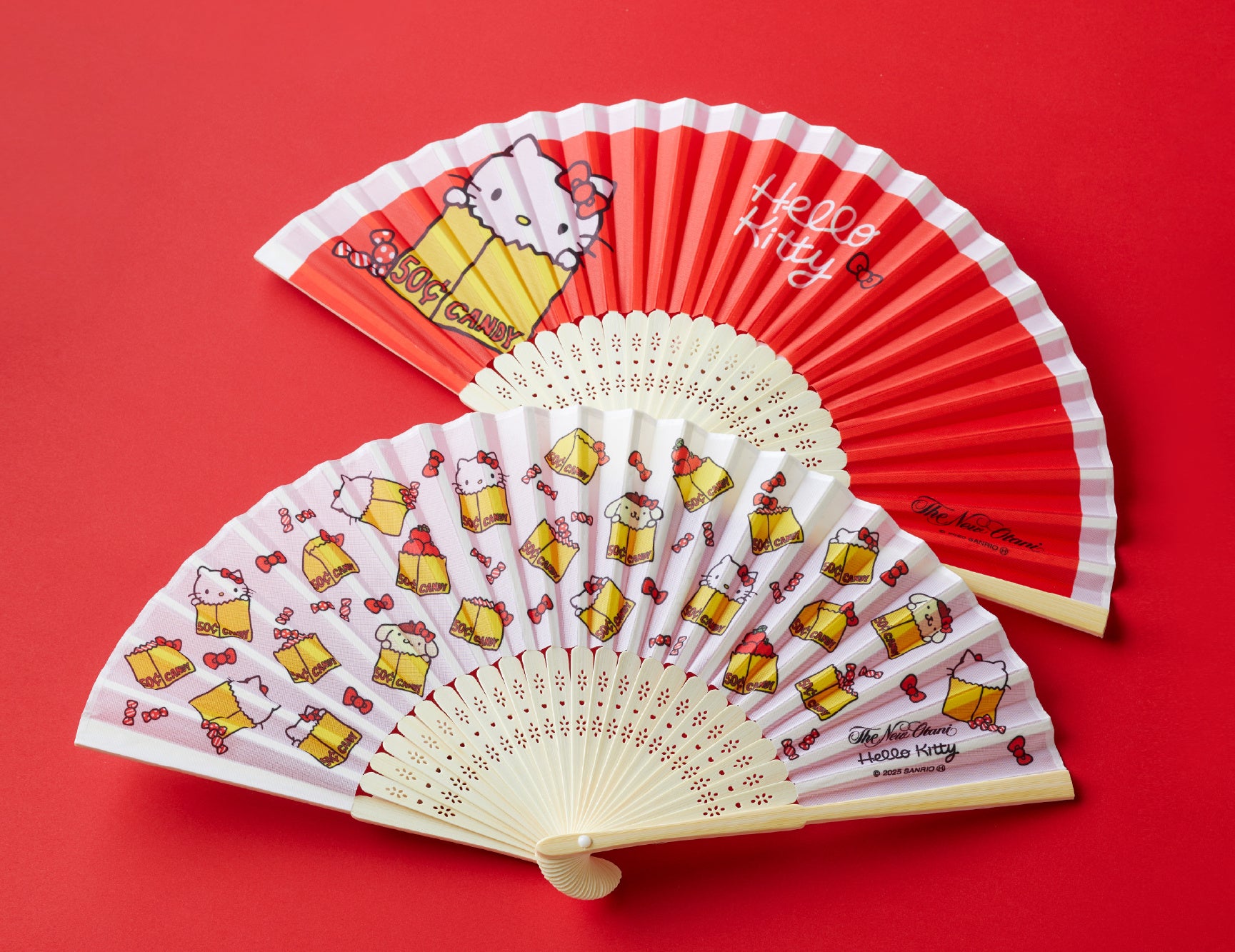 コラボメニューをご注文いただいたお客さまには、夏にうれしい「バケットハット」または「扇子」が特典としてついてきます。特典は、ハローキティ展に合わせた特別デザイン。ここでしか手に入らない限定アイテムとなっております。ハローキティの世界観とともに、特別な夏の思い出をお持ち帰りください。