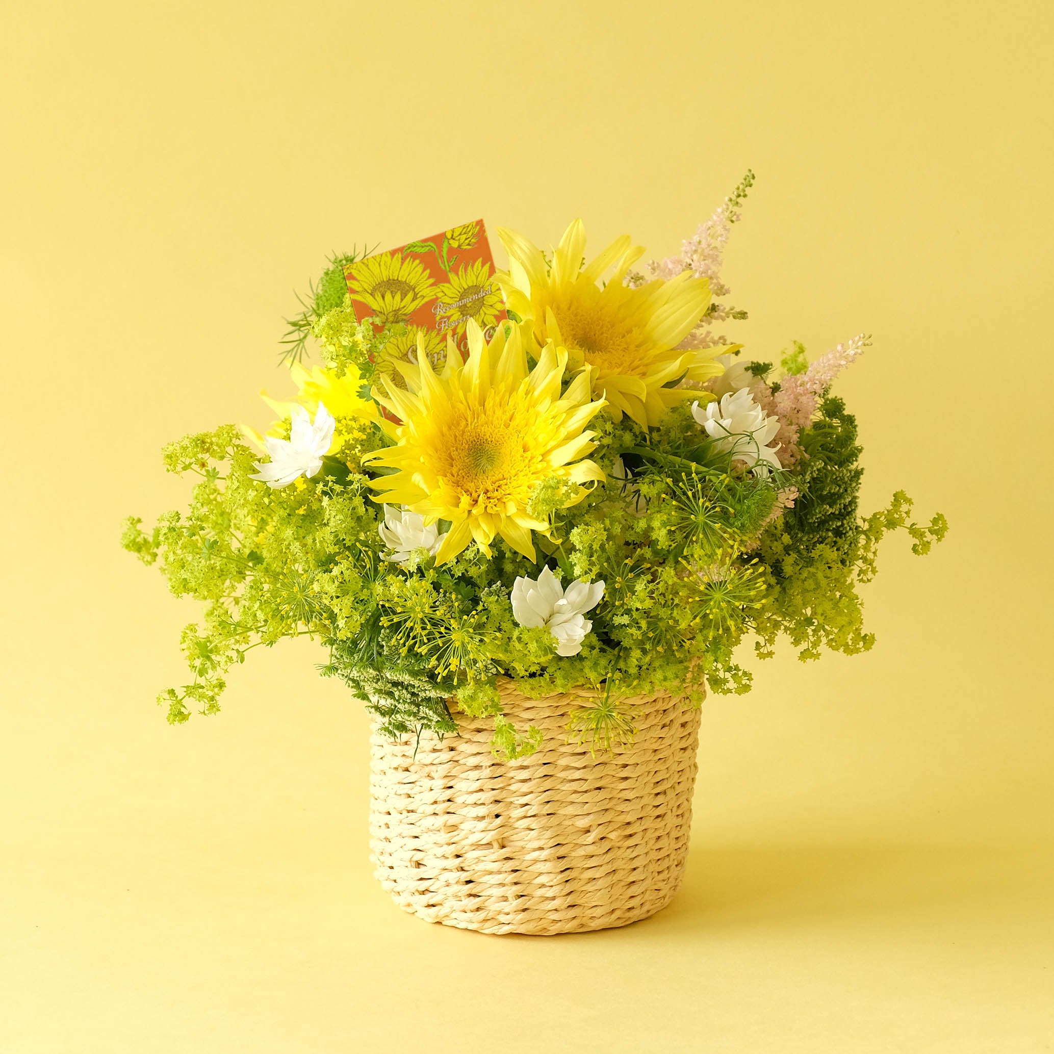 ショップおすすめのひまわりをナチュラルなアレンジメントに仕上げました。器付きのためそのまま飾って楽しめます。