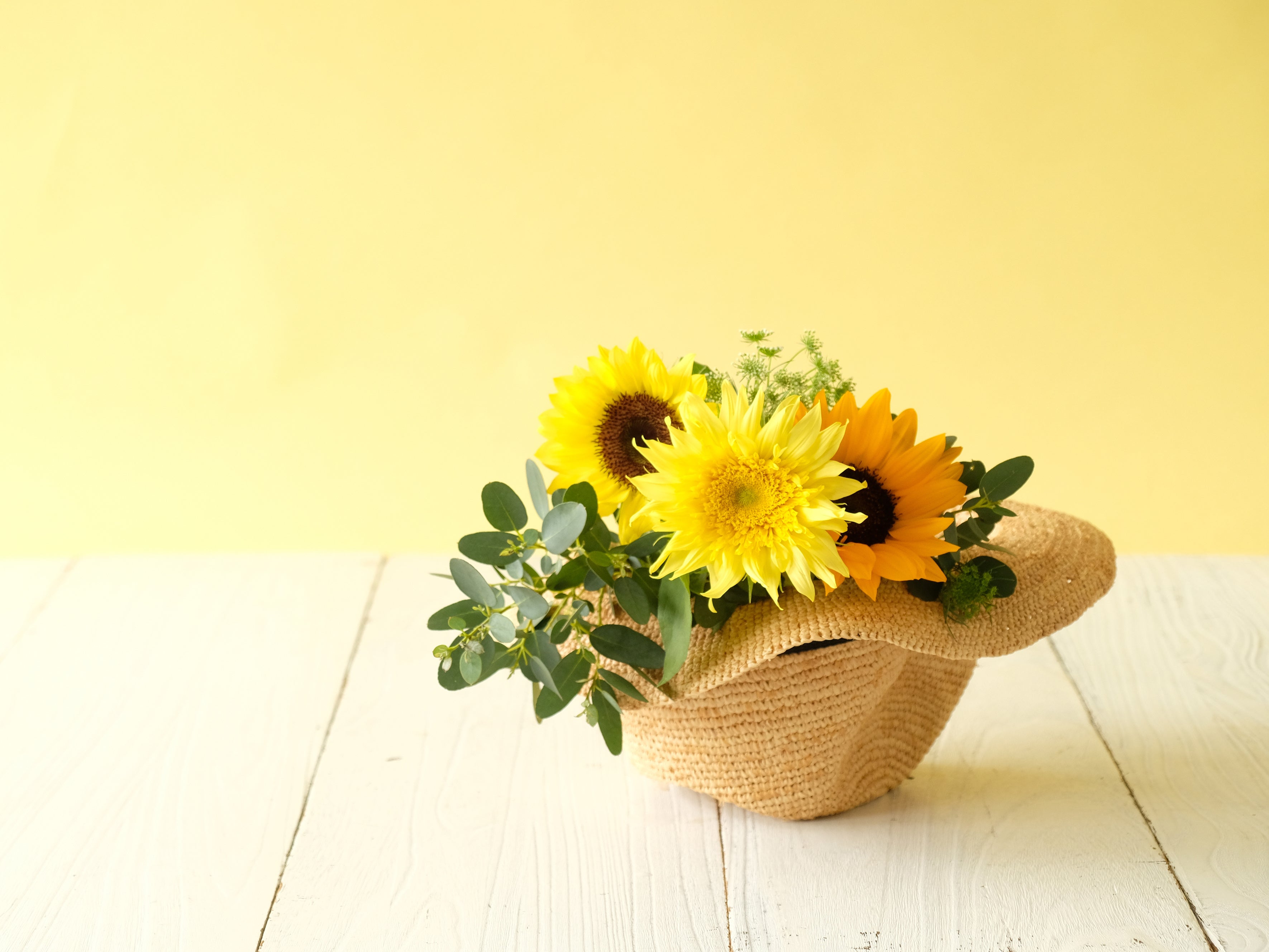 左上:『ひまわりのサマーブーケS』をコップにいけて、逆さにした麦わら帽子にセット。夏にぴったりのあしらいです。かごバックなどの夏のファッションアイテムでもぜひお試しくださいね。