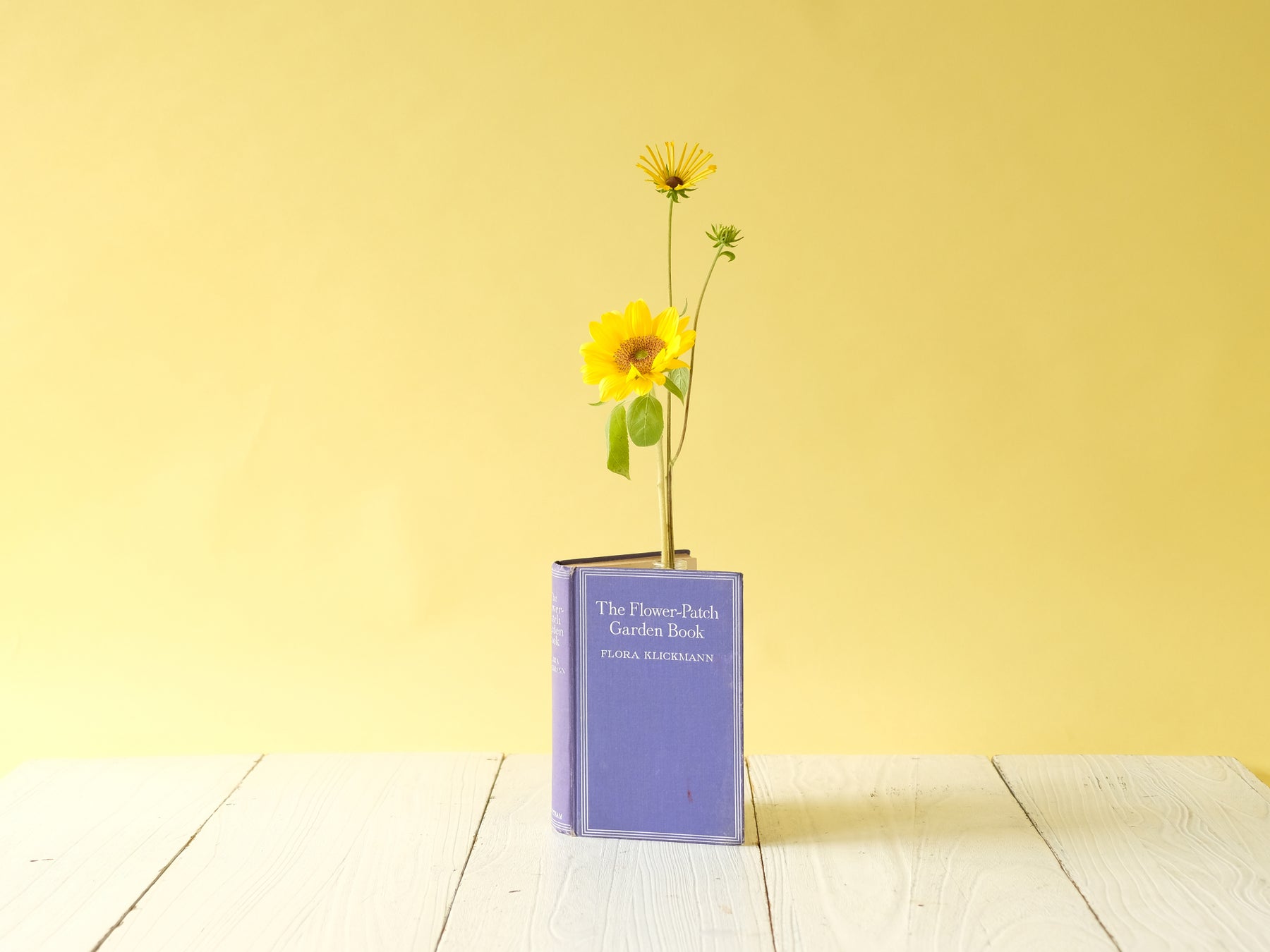 右上:本を広げて立て、ひまわりをいけたスリムな瓶を挟みました。自立できる厚さの本であればどんな本でも大丈夫です。デスク脇などちょっとした場所におすすめです。