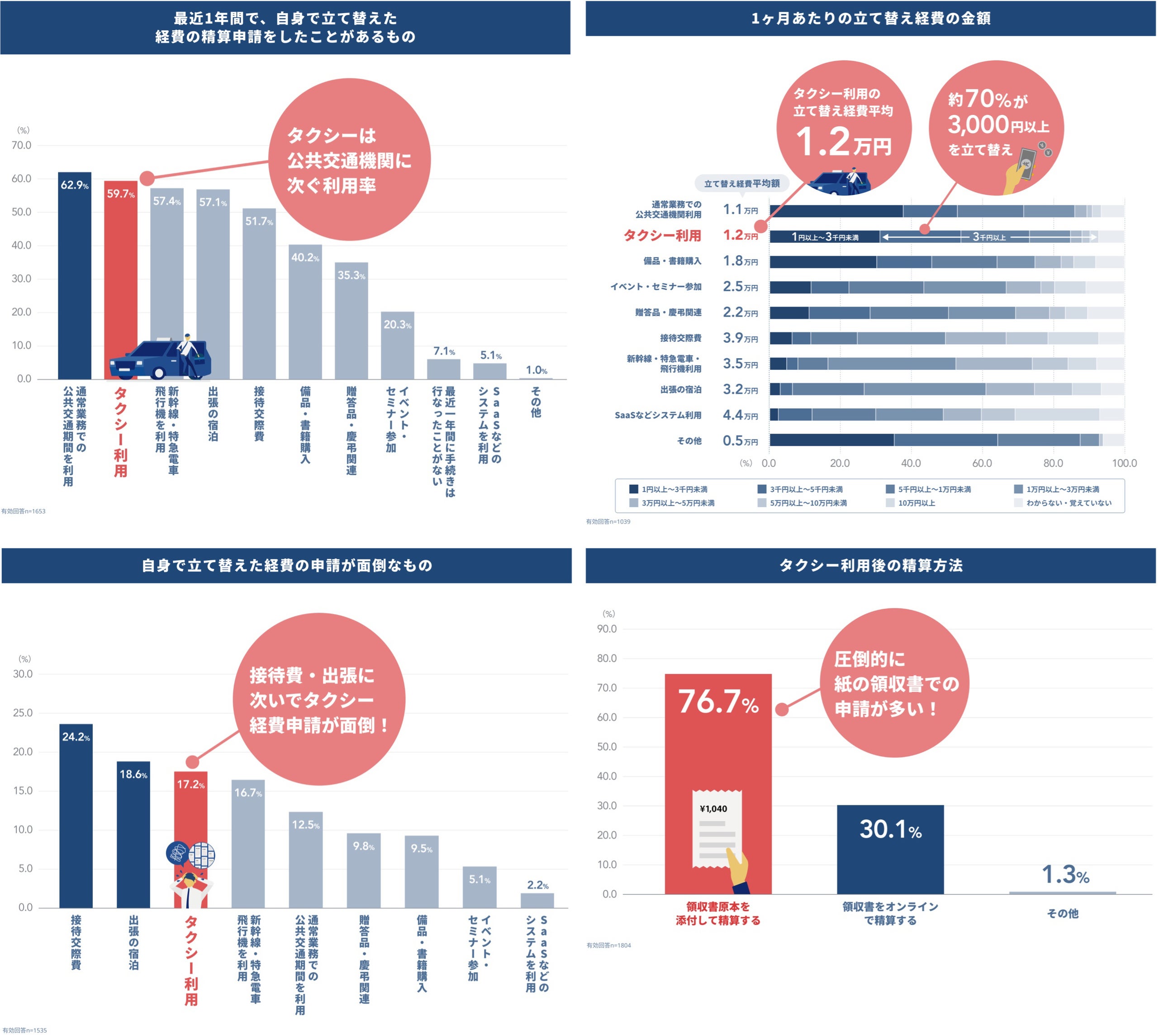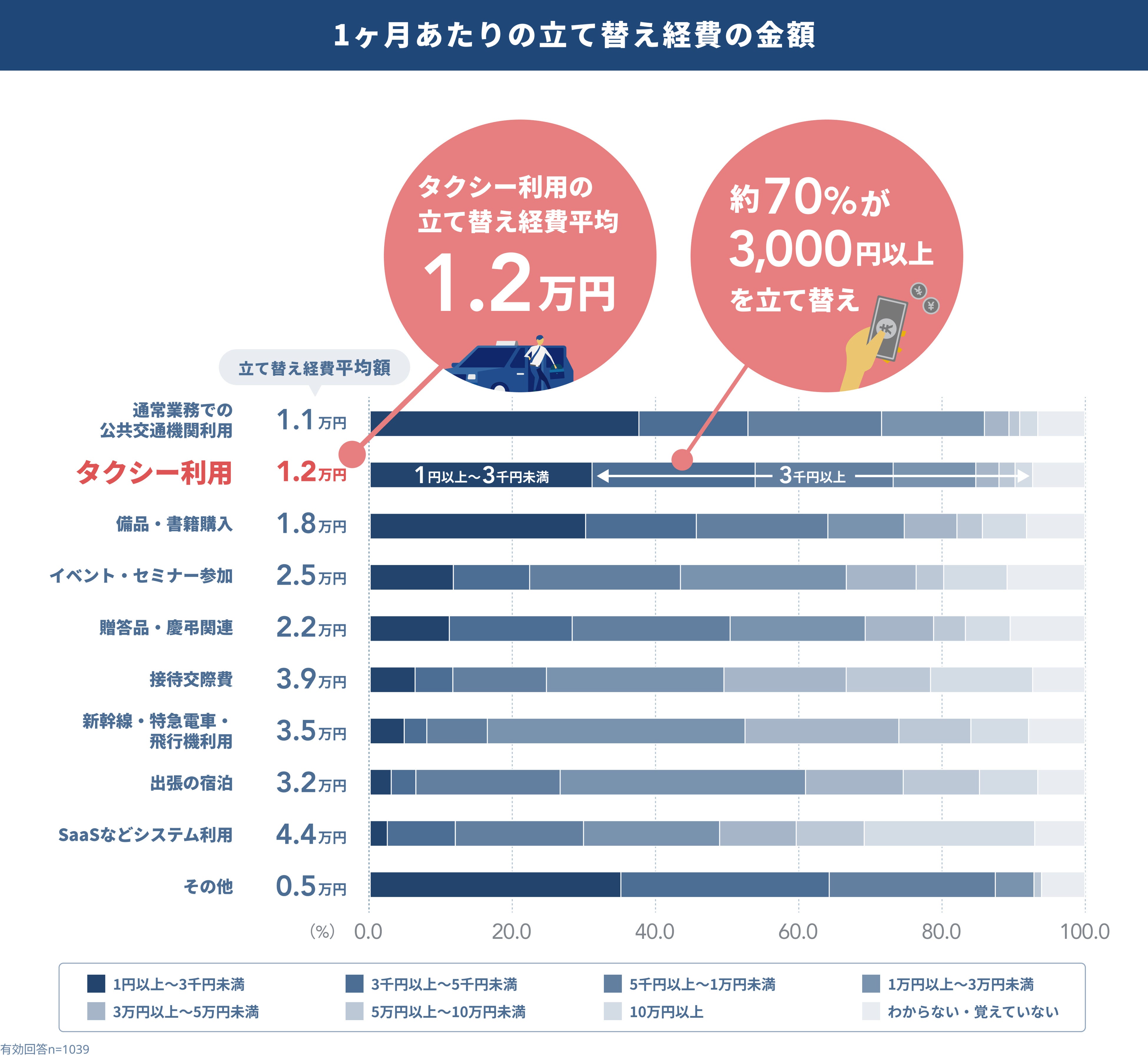 -1ヶ月あたりの平均金額は1.2万円程度。約70%が月額3,000円以上をタクシー経費として立て替えている。