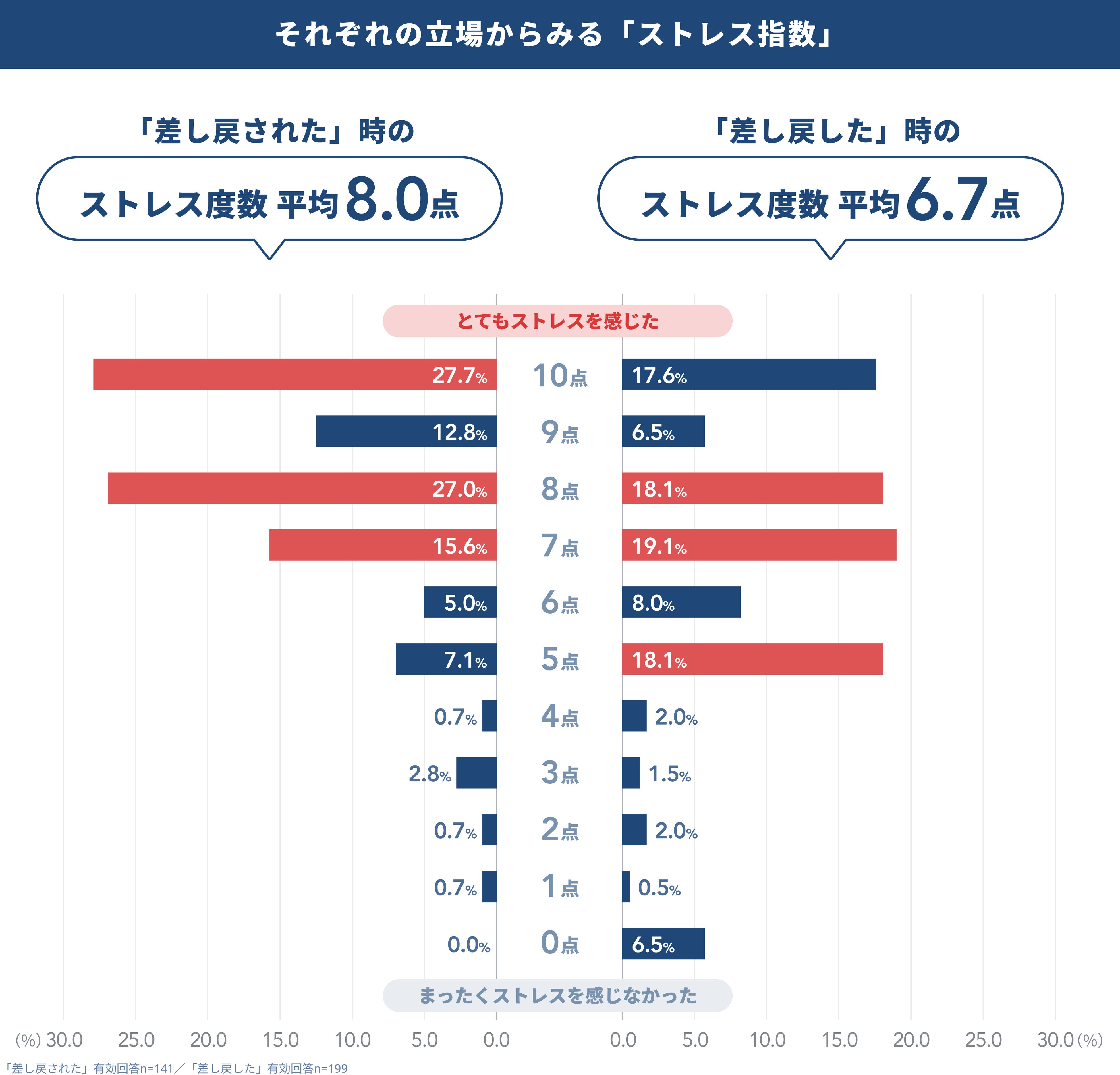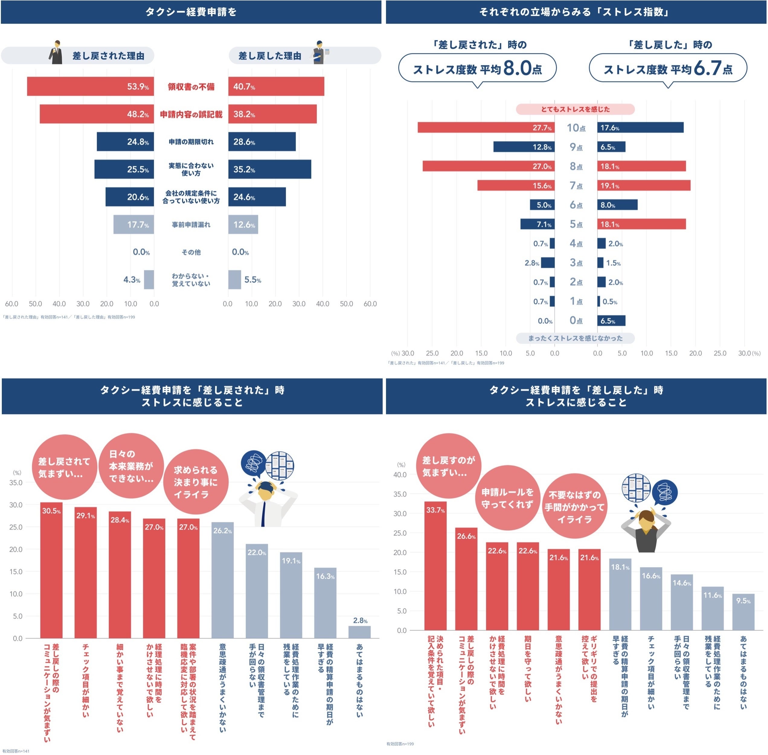 -差し戻し発生時のストレス指数は、10点満点中、承認側は6.7点に対し、申請する側は8.0点と上回る結果に。