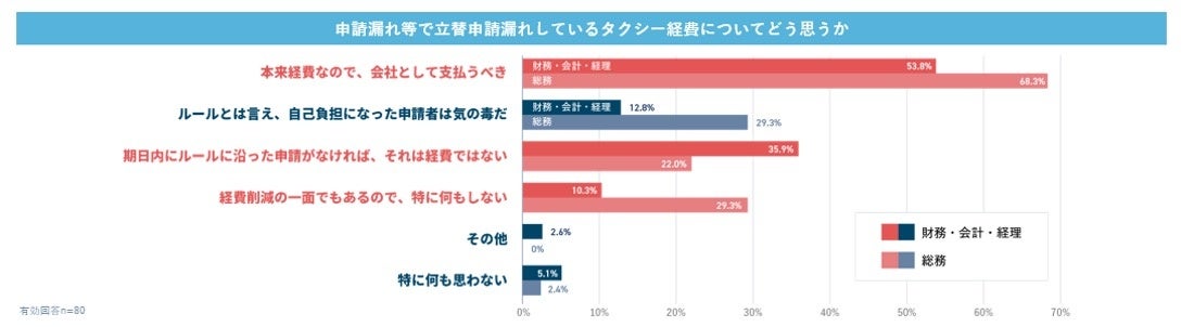 申請漏れ等で、タクシー経費が自腹になってしまった経験を持つ人は全体の30%強と、3人に1人が該当する結果となりました。そのうち約70%は3,000円以上の金額負担をしてしまったことがあり、経営層になると約40%が1万円以上の自腹経験ありと、役職が上がるほどに規模が上がる傾向となり、なんと10万円以上を負担してしまった方もいらっしゃいました。領収書を実際に受け取る経理・総務は「期日内の申請がなければそれは経費ではない」「経費削減の一面でもある」と厳しい視点を持ち、企業のコスト管理を預かるセクションとして厳格な運用をされていることが改めて垣間見えました。その一方、本来は経費なので支払うべきという視点も半数以上と多く、申請漏れを防ぐ仕組みづくりが重要かと思われます。