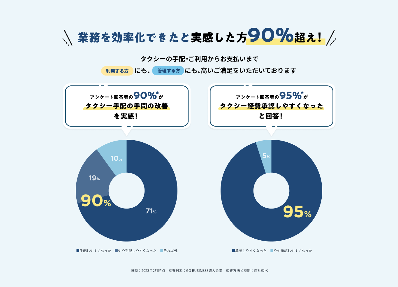 3. 導入企業の満足度は90%超え。タクシー手配の効率が上がったと回答された方90%、タクシー経費精算の効率が上がったと回答された方が95%と、高い利用満足を実感頂いております。