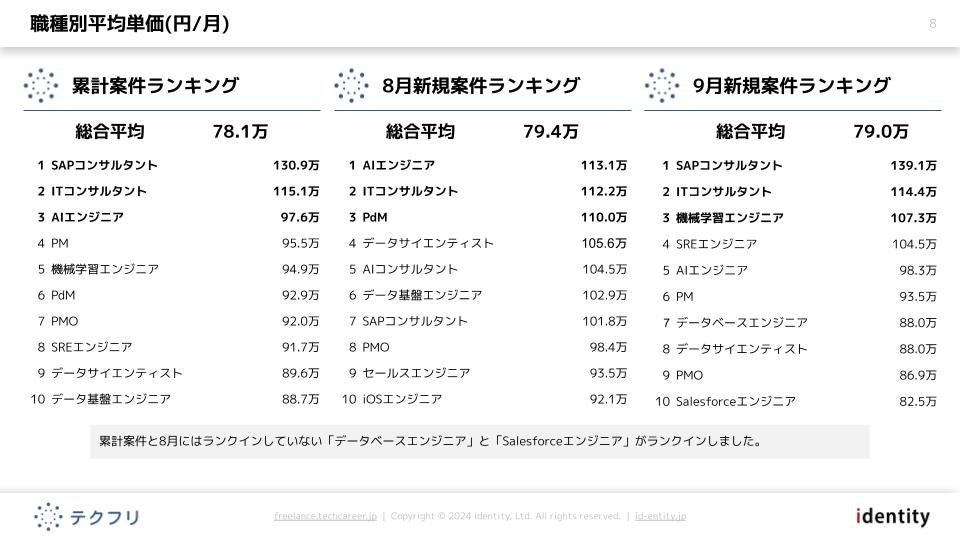 累計案件と8月にはランクインしていない「データベースエンジニア」と「Salesforceエンジニア」がランクインしました。