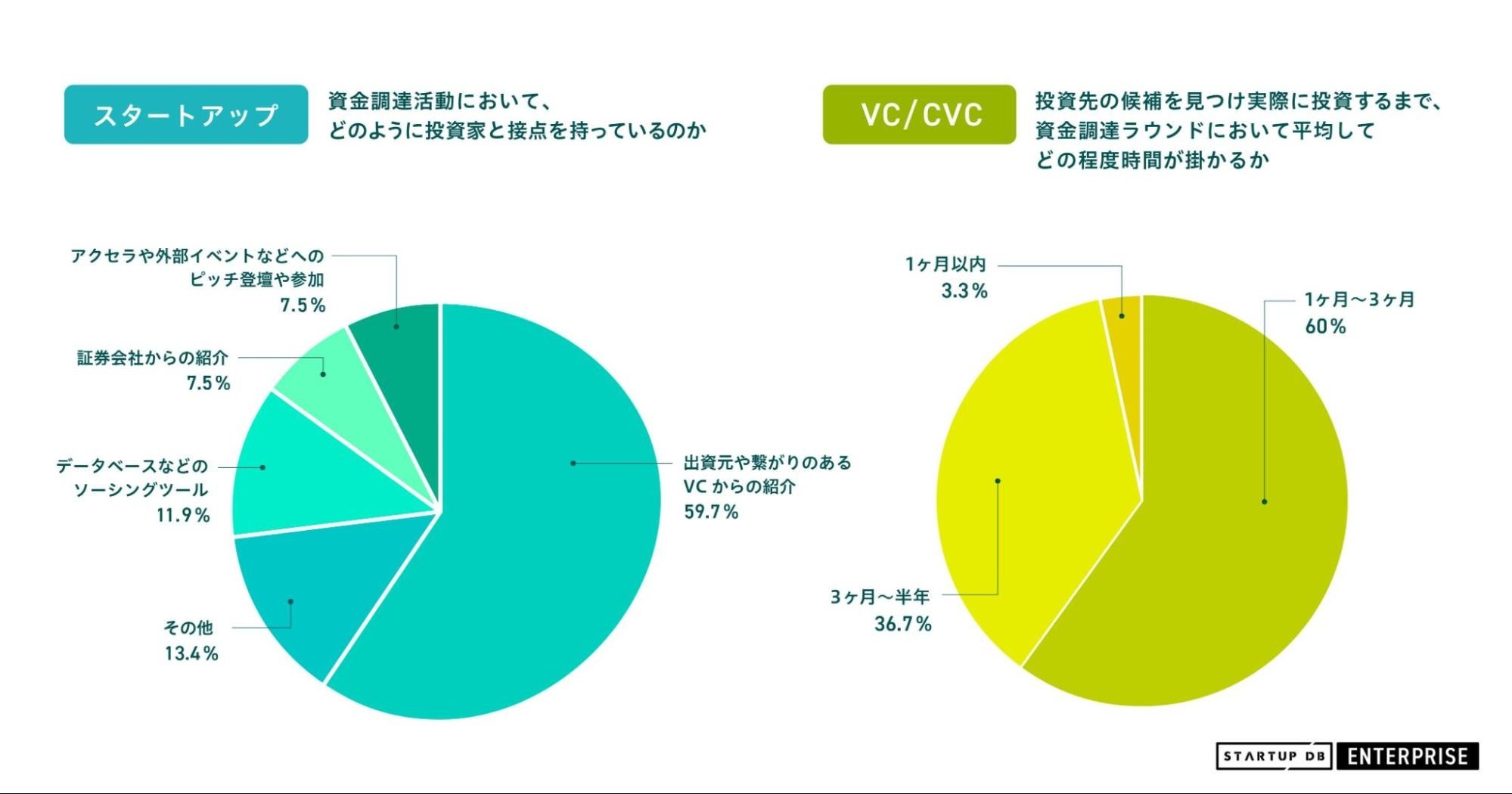 一方、投資家側であるVC/CVCとしては、資金調達ラウンドにおいて、投資先の候補を見つけ、実際に投資するまで「1ヶ月〜3ヶ月で実行されることが多い」と60%が回答。1ヶ月以内での投資も含めると63.3%が3ヶ月以内に投資していることになります。