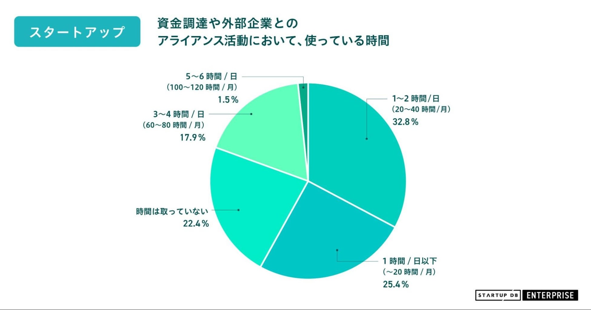 資金調達や外部企業とのアライアンス活動において使ってる時間は25.4%が1時間/日以下、時間はとっていないと回答したのは22.4%と約5割のスタートアップ企業はアクションに対する時間は月20時間未満と、時間が足りないことがボトルネックとなっています。