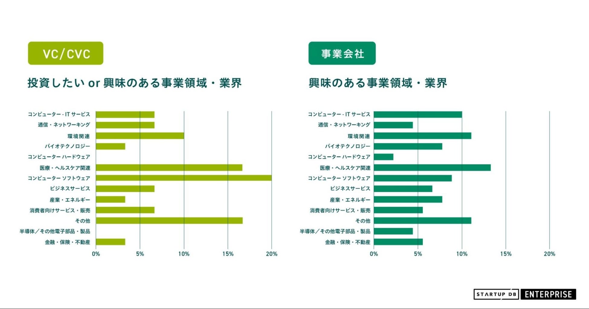 事業会社は、本業との事業シナジーを追求したストラテジックリターンを重視する傾向にあります。そのため、興味のある投資領域は会社ごとに変わることがあります。その結果、興味のある事業領域・業界は幅広く分散していると考えられます。
