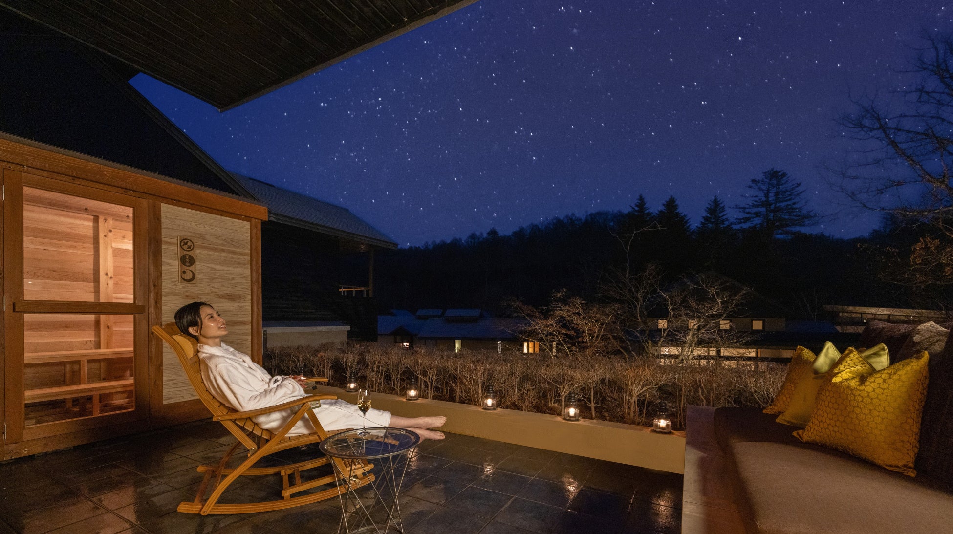 本プログラムでは、テラスに中温高湿のサウナが設置された特別な客室を用意します。サウナは熱と蒸気によって体を深部から温める「ウェットサウナ」方式で、高湿の水蒸気を発生させる「ロウリュ」も可能です。また、外気浴を楽しめるよう、テラスにグラビティチェアを設置します。テラスからは満天の星空や霧氷など冬の軽井沢の情景を望むことができ、周囲からは見えないよう配慮もなされているため、プライベートな空間で開放的な外気浴を楽しめます。また、客室風呂の水は浅間山の伏流水です。この水は軟水で皮膚刺激が少ないので、外気浴後にぬるめの温度で入浴することで乾燥しがちな肌をいたわることができます。