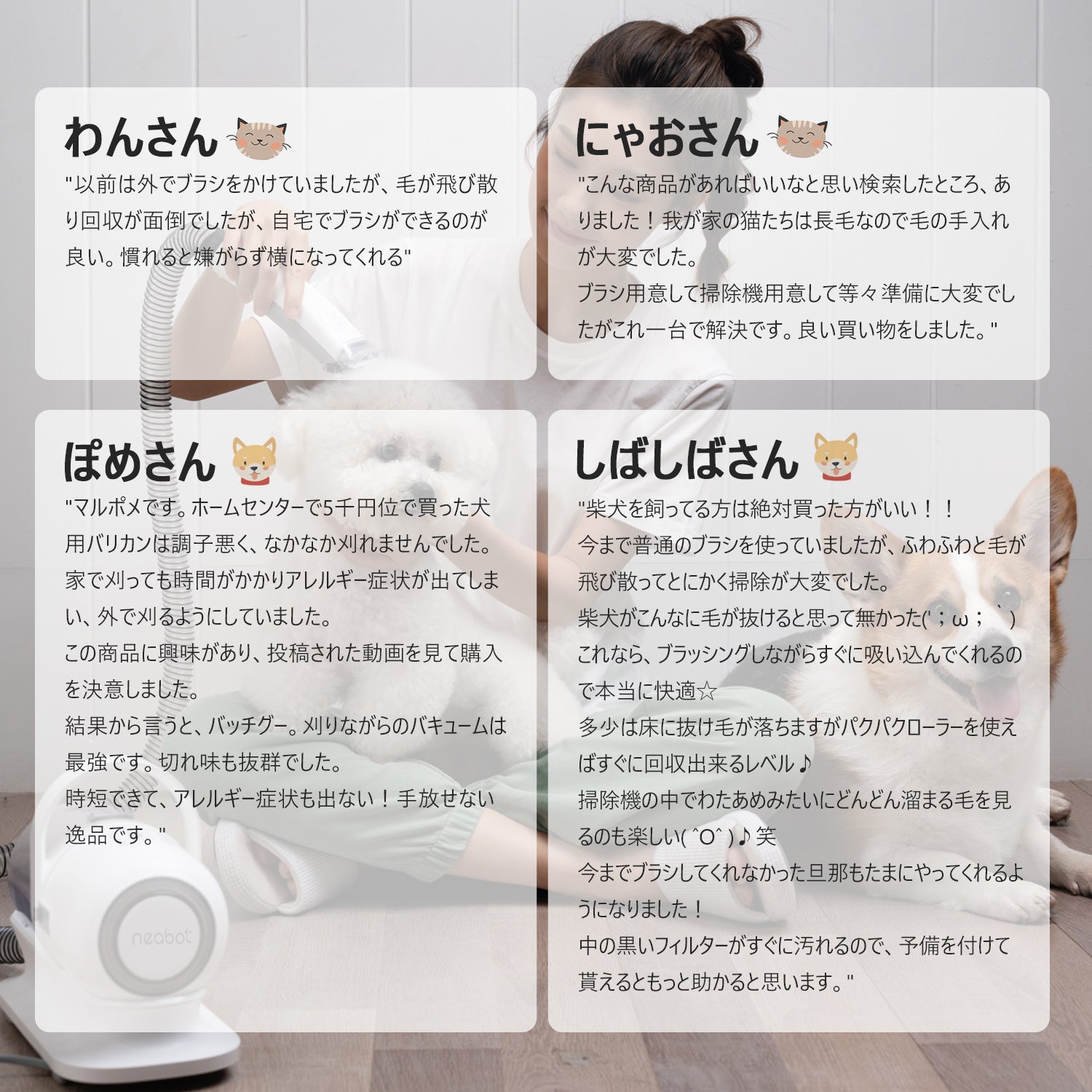Neakasa P1PRO の特徴は、ペットの毛をケアしながら自動回収・お掃除できるところです。トリマー、ドッグトレーナー、警察犬訓練所にも愛用頂いています。