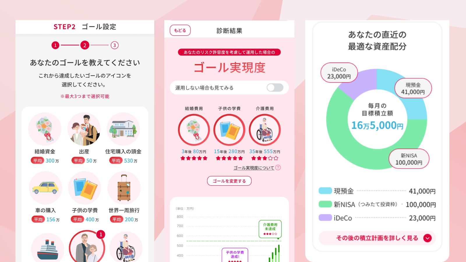 お金を4つに色分けすることで、手元に資金を確保しつつ、余裕資金は運用として有効活用することが可能です。これから実現したいゴールを最大3つまで任意で選択し、ゴールごとの必要な費用や時期を選択することができます。