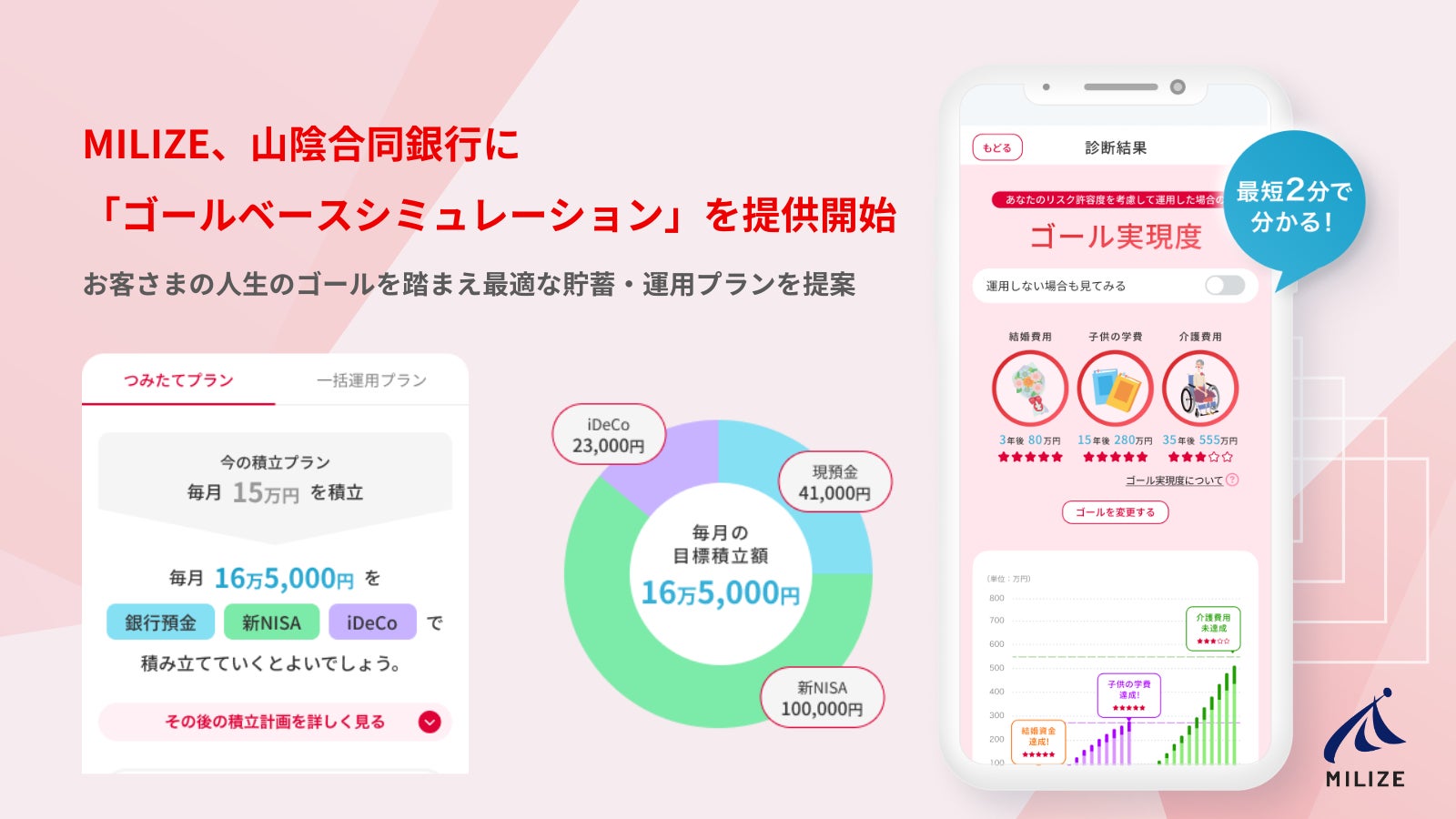 株式会社MILIZE(本社:東京都港区、代表取締役社長:田中 徹、以下「MILIZE」)は、株式会社山陰合同銀行(本社:島根県 松江市、取締役頭取 山崎 徹、以下「山陰合同銀行」)に対して、「ゴールベースシミュレーション*」の提供を開始しました。